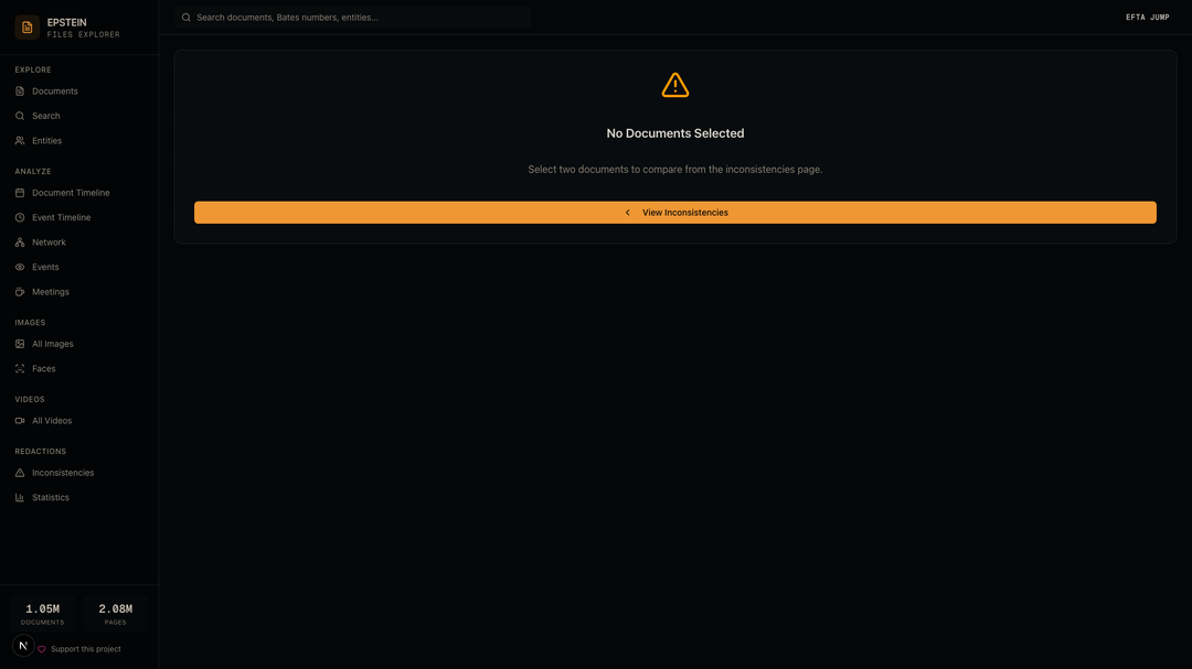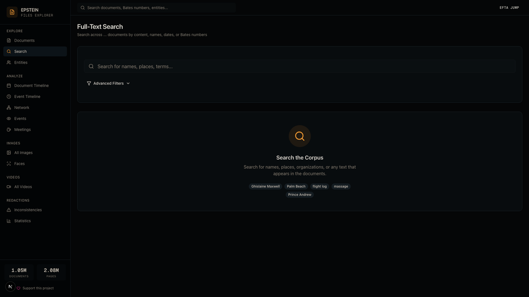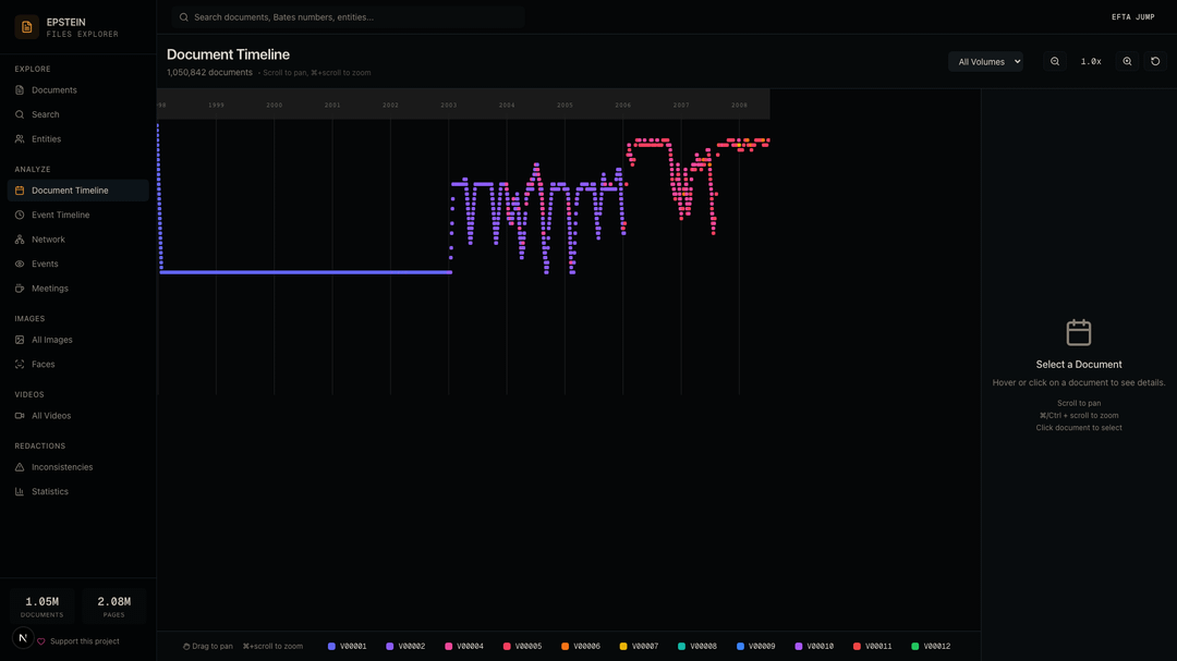 Over the past ~2 weeks I've been building an open-source tool to systematically analyze the Epstein Files — the massive trove of court documents, flight logs, emails, depositions, and financial records released across 12 volumes. The corpus contains 1,050,842 documents spanning 2.08 million pages.