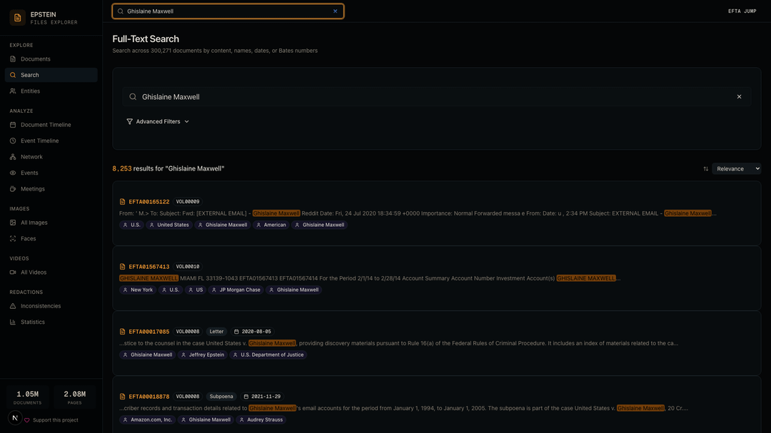 2. Search Results — Full-text semantic search. Searching "Ghislaine Maxwell" returns 8,253 documents with highlighted matches and entity tags.