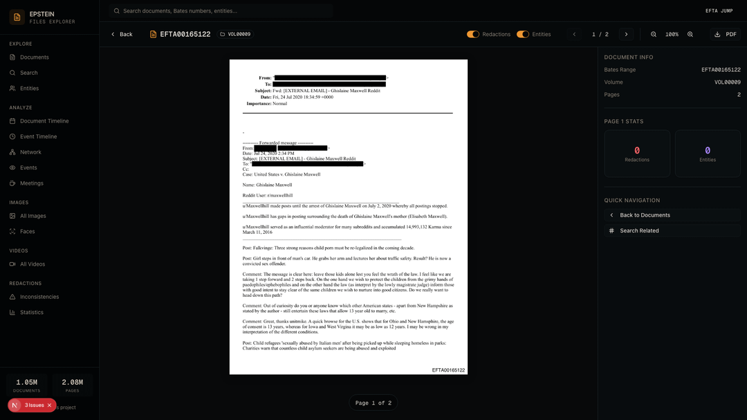 3. Document Viewer — Integrated PDF viewer with toggleable redaction and entity overlays. This is a forwarded email about the Maxwell Reddit account (r/maxwellhill) that went silent after her arrest.