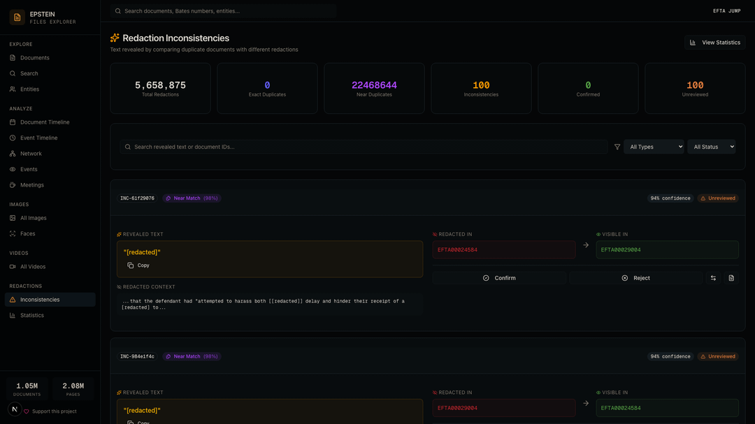8. Redaction Inconsistencies — The pipeline compared 22 million near-duplicate document pairs and found 100 cases where redacted text in one document was left visible in another. Each inconsistency shows the revealed text, the redacted source, and the unredacted source side by side.