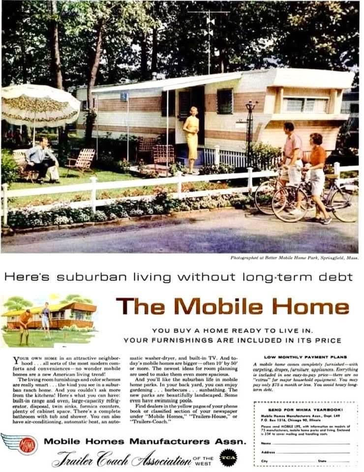 Mobile homes (then often called trailers or trailer coaches) as an affordable, modern alternative to traditional suburban housing, emphasizing no long-term debt, included furnishings, and low monthly payments
