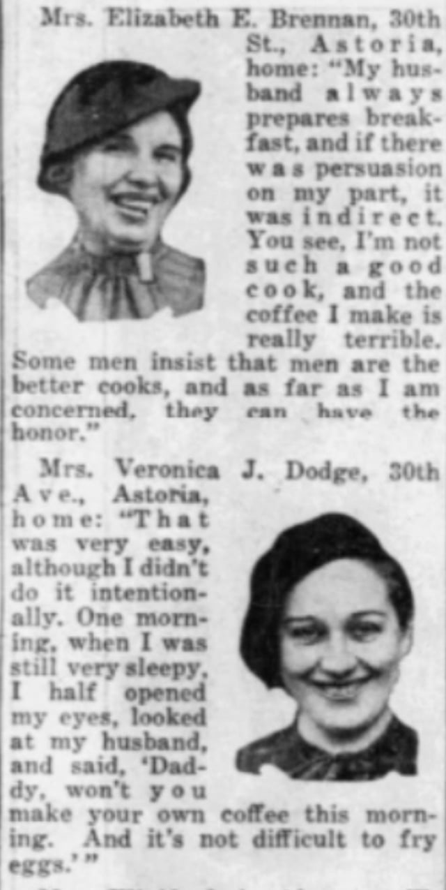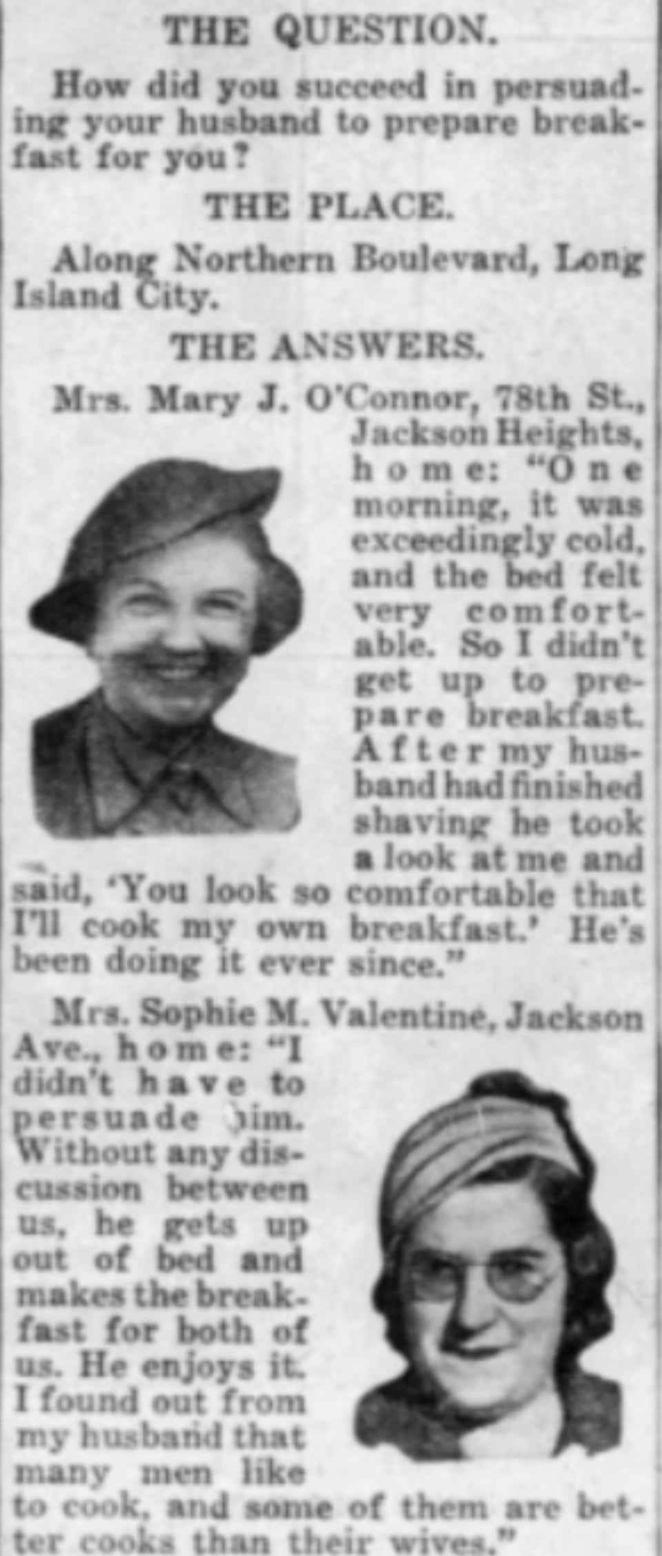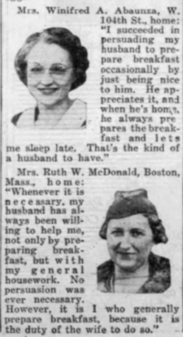 Inquiring Photographer: “How did you succeed in persuading your husband to prepare breakfast for you?” January 13, 1938 by CryptographerKey2847