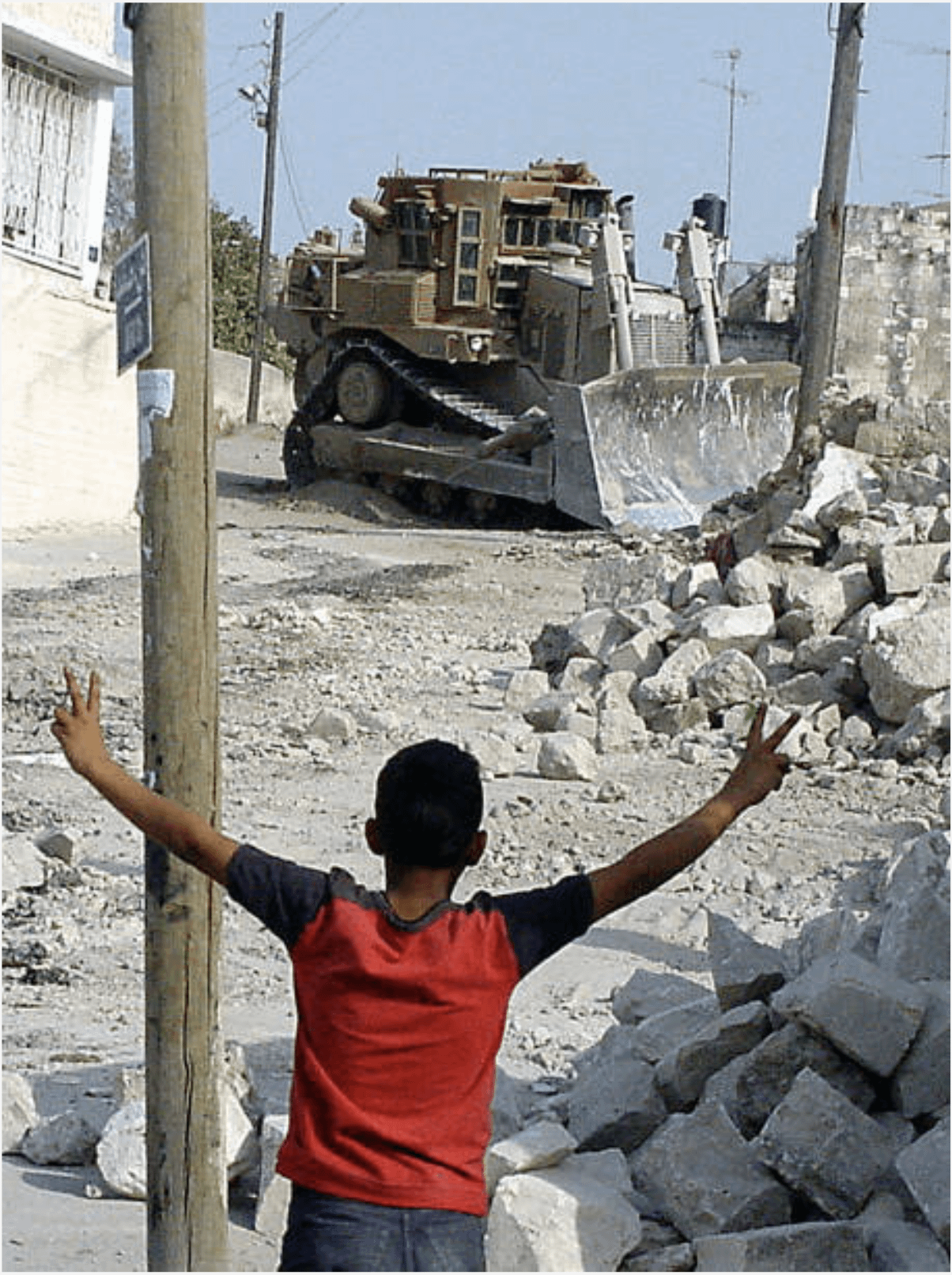 A Palestinian child flashes peace signs at an Israeli-manned bulldozer demolishing a house in Jenin’s Old City during an operation by the Israeli army in the northern West Bank town on 25 October 2002. [1204 x 1612]