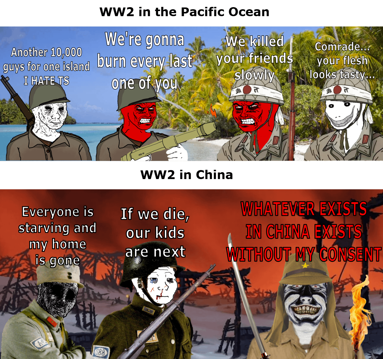 And there was the China front, surpassed only by the Eastern Front in brutality. Nanjing was only the beginning: Japanese armies killed, raped and tortured civilians in every campaign. They terror bombed cities and deployed poison gas thousands of times. They used biological weapons and engineered plague epidemics (they also nearly did at Saipan and Bataan too). By 1941, the Japanese had escalated into a full-blown genocide in rural North China, slaughtering civilians by the millions in the Three Alls Policy.Â