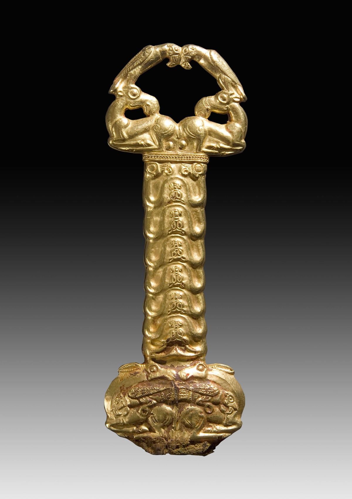 Share Facebook Twitter LinkedIn Pinterest Bluesky Threads Gold sword hilt with sculptured figures of two recumbent elk and birds of prey on their heads, European Scythia/Ukraine, 6th century BC [1200 x 1697] by HydrolicKrane