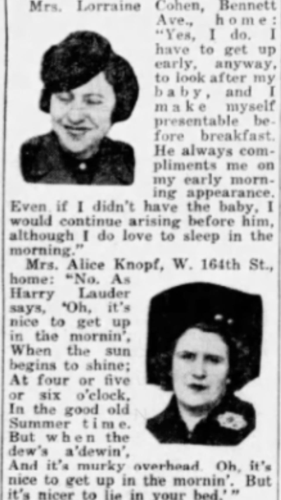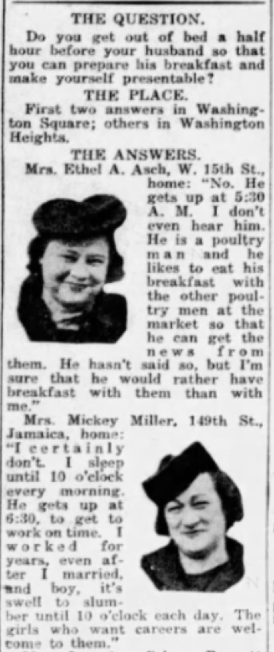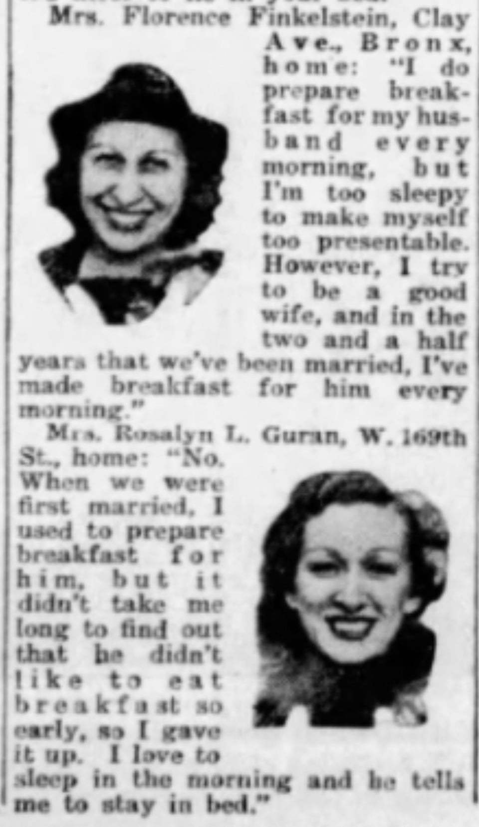 Inquiring Photographer: “Do you get out of bed a half hour before your husband so that you can prepare his breakfast and make yourself presentable?” Jan 31, 1941.