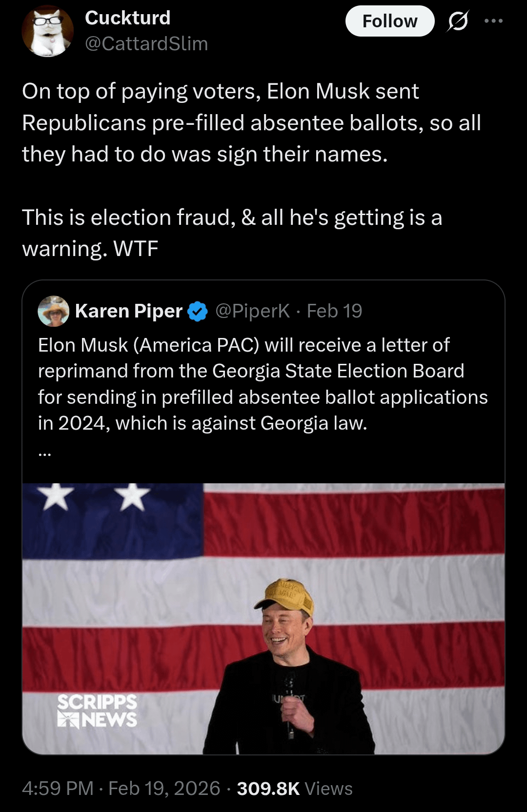I’m not trying to defend Musk here, but what evidence is there he sent prefilled ballots? Absentee ballots are mailed to you by the county. Did he intercept that mail or did he print counterfeits or what was the process?