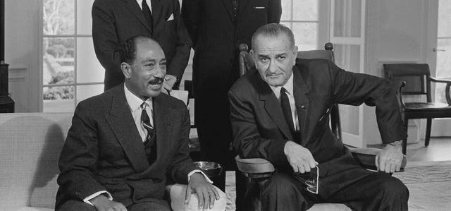 President Lyndon B. Johnson, seated with Anwar Sadat, President of the National Assembly of Egypt, during his visit to Washington D.C. (1966) [640×300]