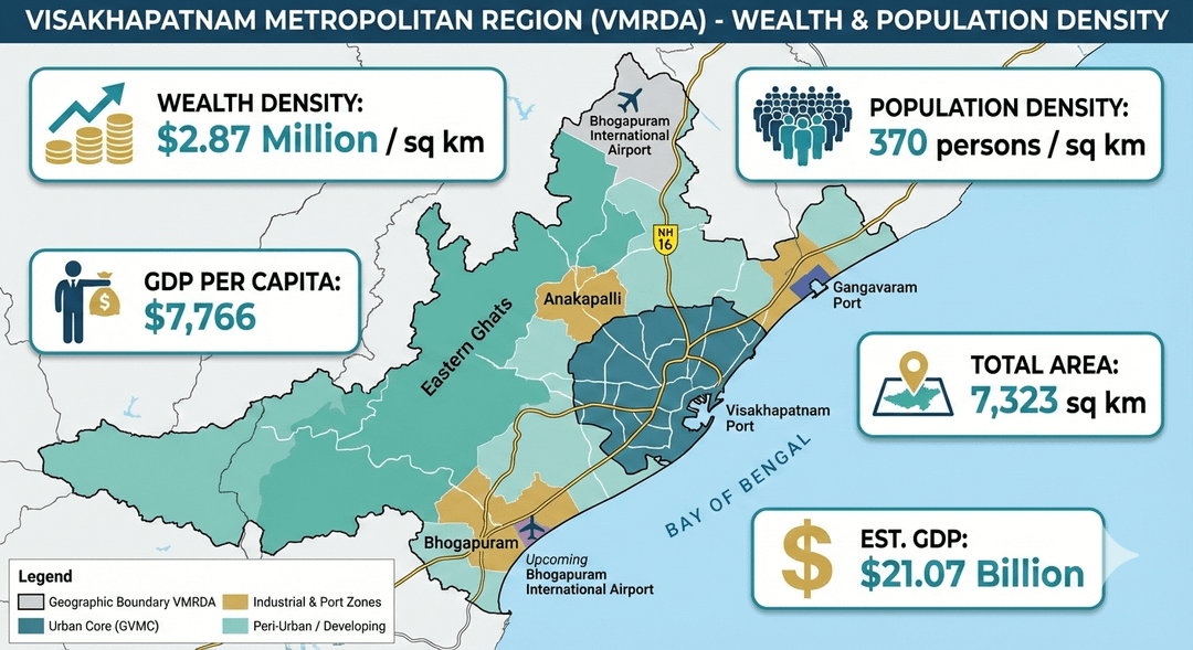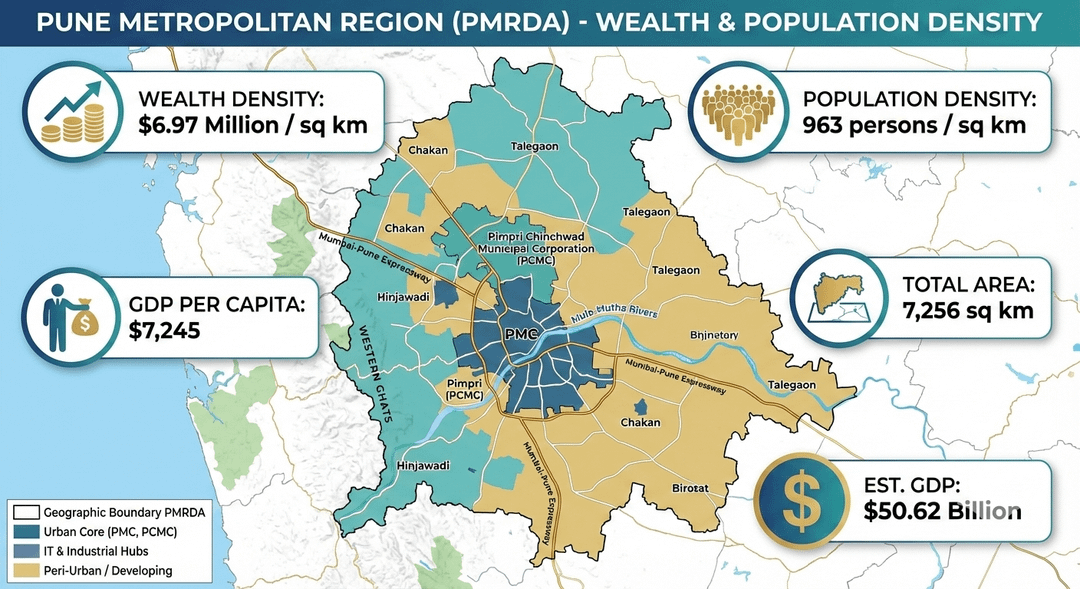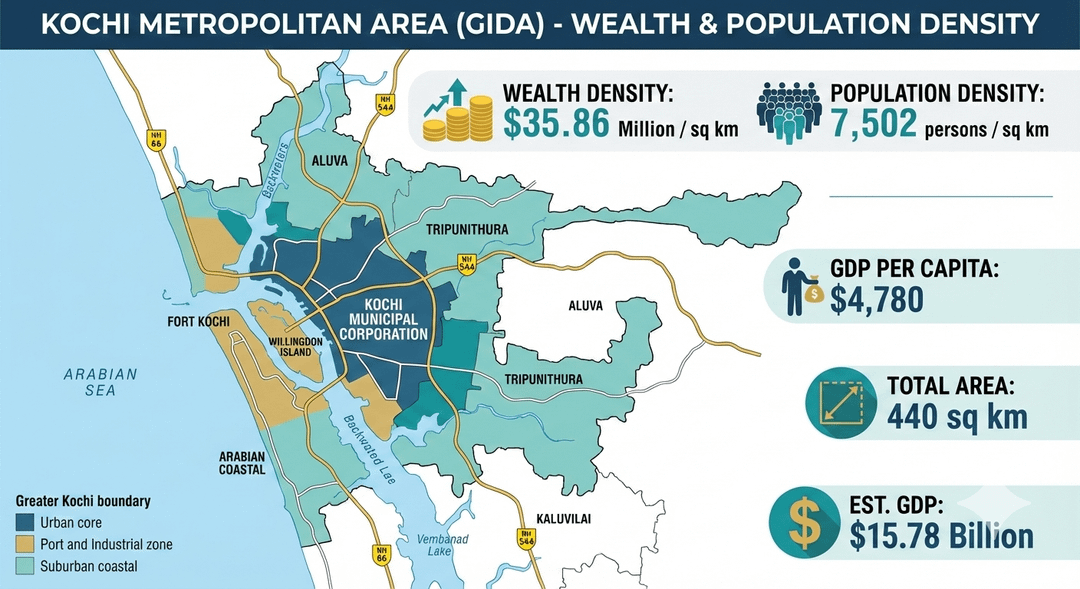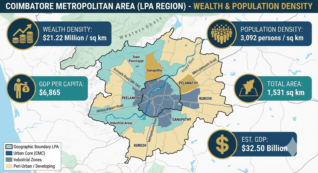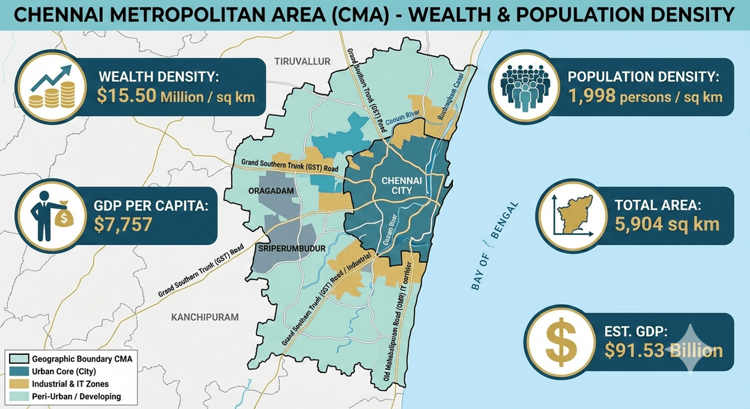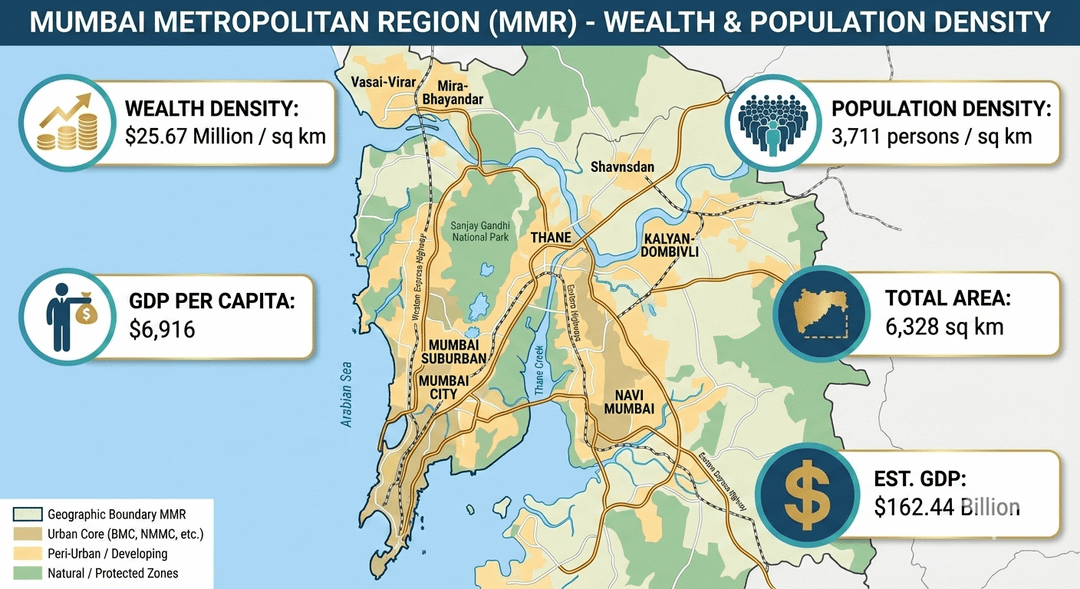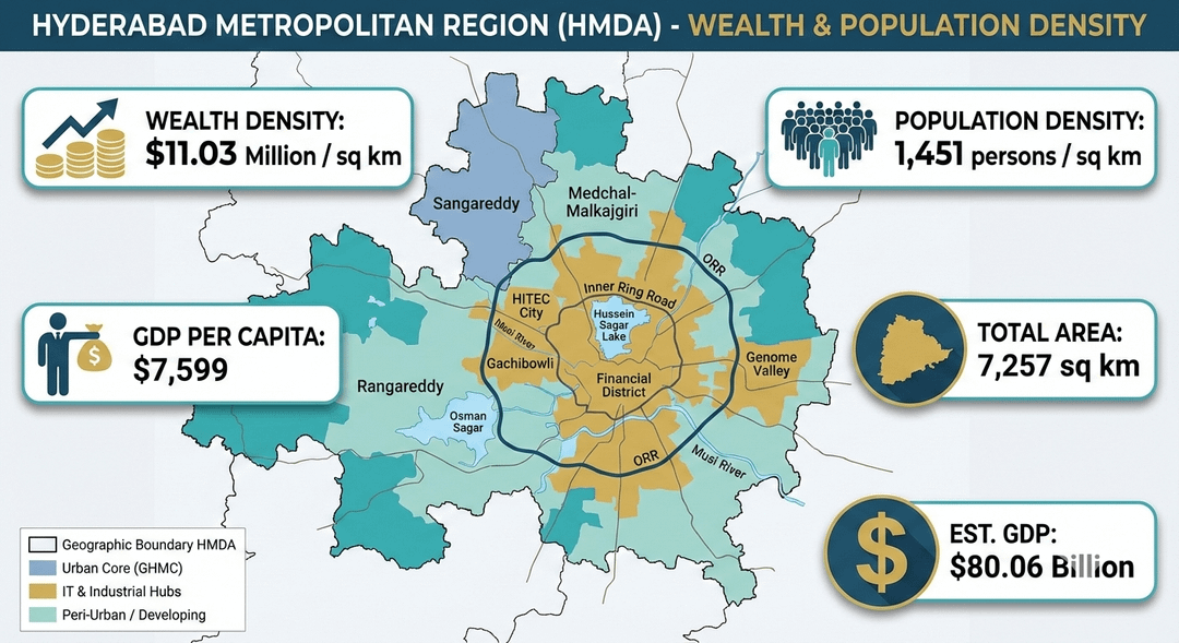 The Southern Hubs: Bengaluru, Hyderabad, and Chennai show a very balanced profile. They have massive overall GDPs, but their expanded metropolitan areas (like BMRDA and HMDA) mean their wealth density isn't as hyper-concentrated and chaotic as Mumbai's MMR.