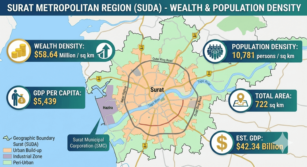 The Gujarat Advantage: Cities like Vadodara, Surat, and Ahmedabad are quietly dominating. Vadodara actually topped this list for GDP per capita ($9,082), completely beating out Bengaluru ($8,521) and Mumbai ($6,916).