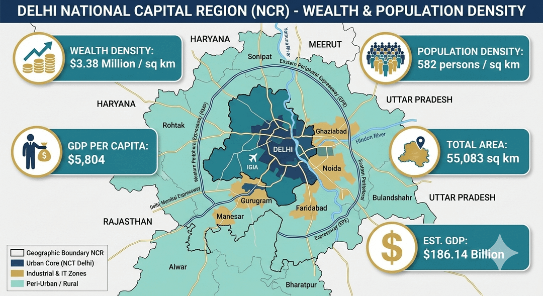 The Sprawl vs. The Squeeze: Delhi NCR is an absolute behemoth in terms of sheer area (over 55,000 sq km) and overall GDP ($186B). But because it's so massively spread out, its population density (582 persons/sq km) is a fraction of the incredibly squeezed Kolkata (6,500/sq km) or Mumbai (3,711/sq km).