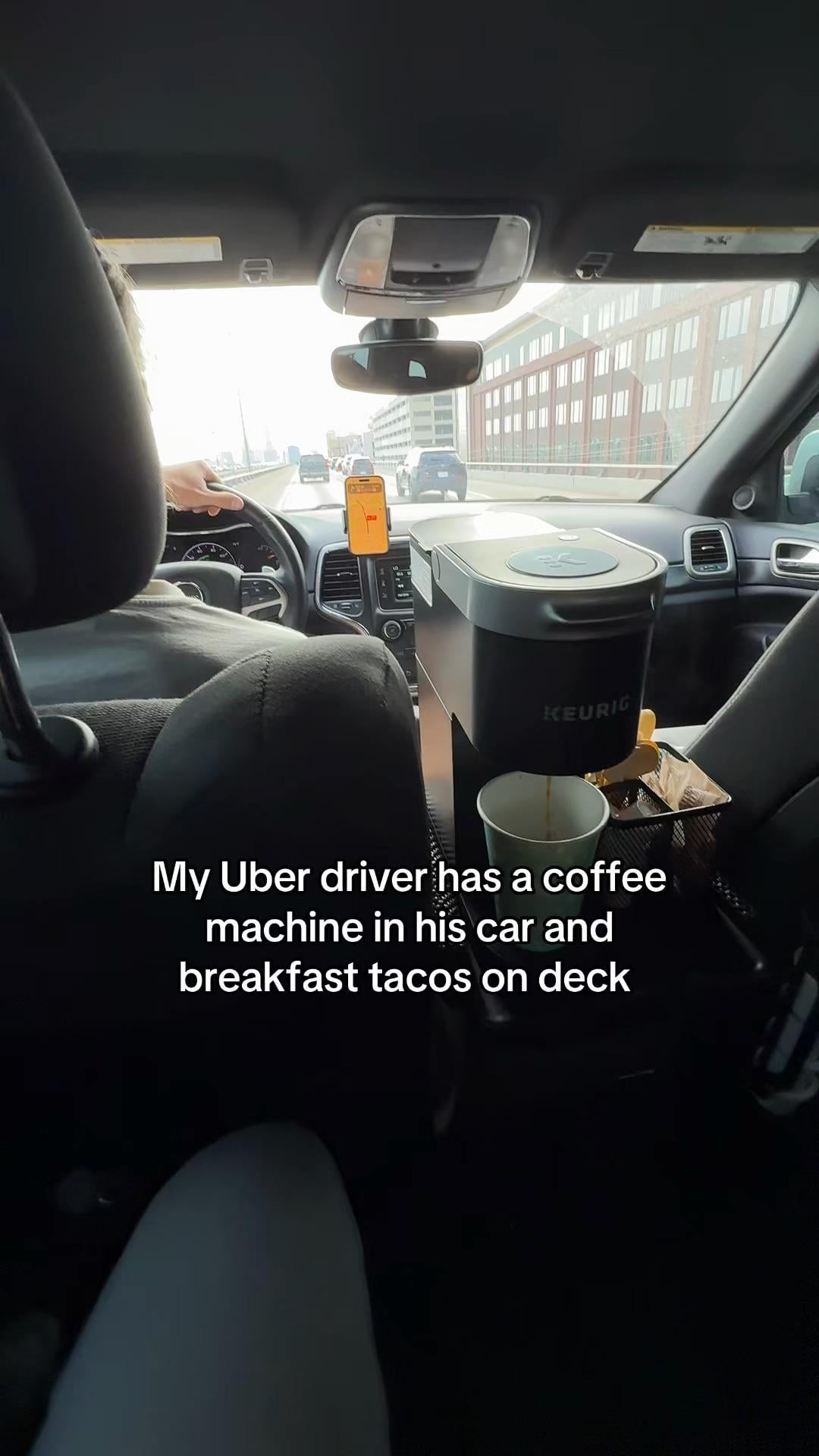 Nothing about this set up feels good. People spill coffee on themselves and try to sue, people spill coffee on your seat and floor and now you have to stop taking fares to clean up. Extra clean up time for the creamers and sugar packets and k-cups. You get a fare that requires all the rear seats now you have to rearrange shit. Plus the cost of all that. Cool customer service minded idea but the net benefit just doesn’t seem worth it.