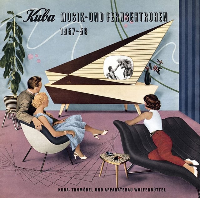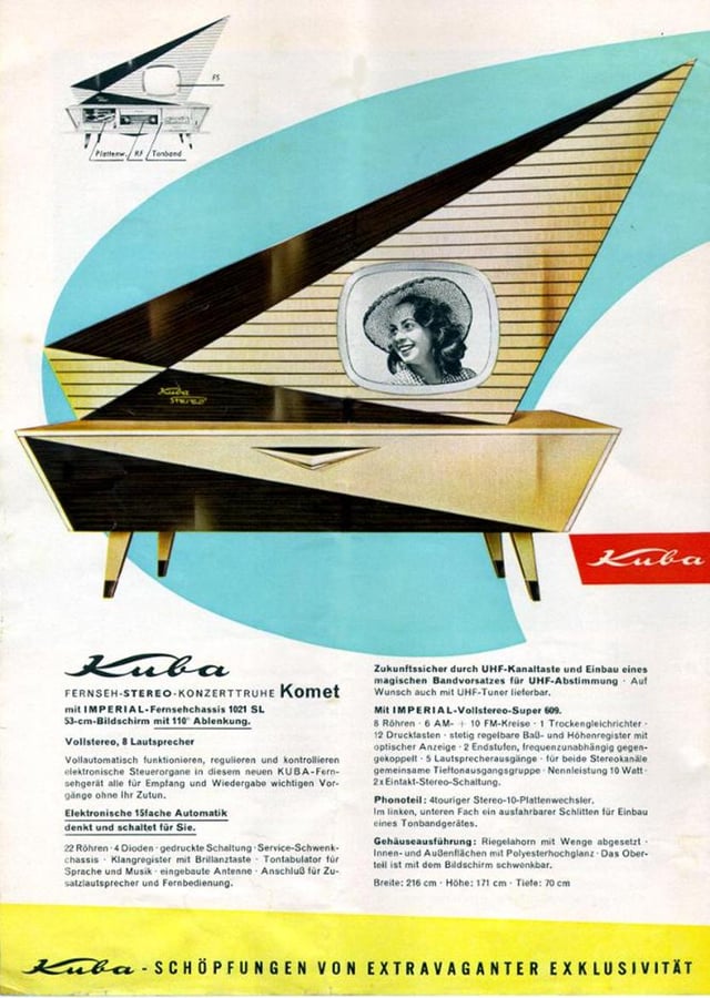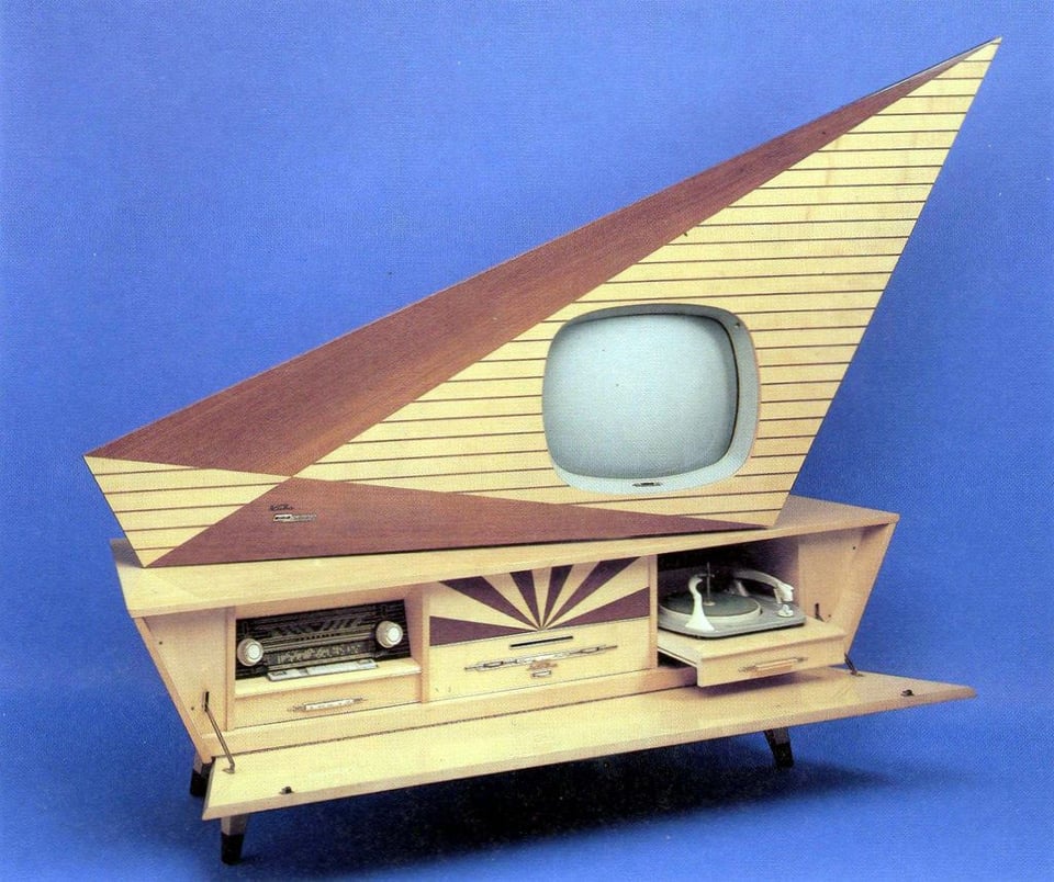 23" television, 8 speakers, multi-band radio receiver, Telefunken phonograph. It's got that classic retro-future 'Googie' style to my eye . Absolutely love it . ' Telefunken ' – is a word to be cherished.