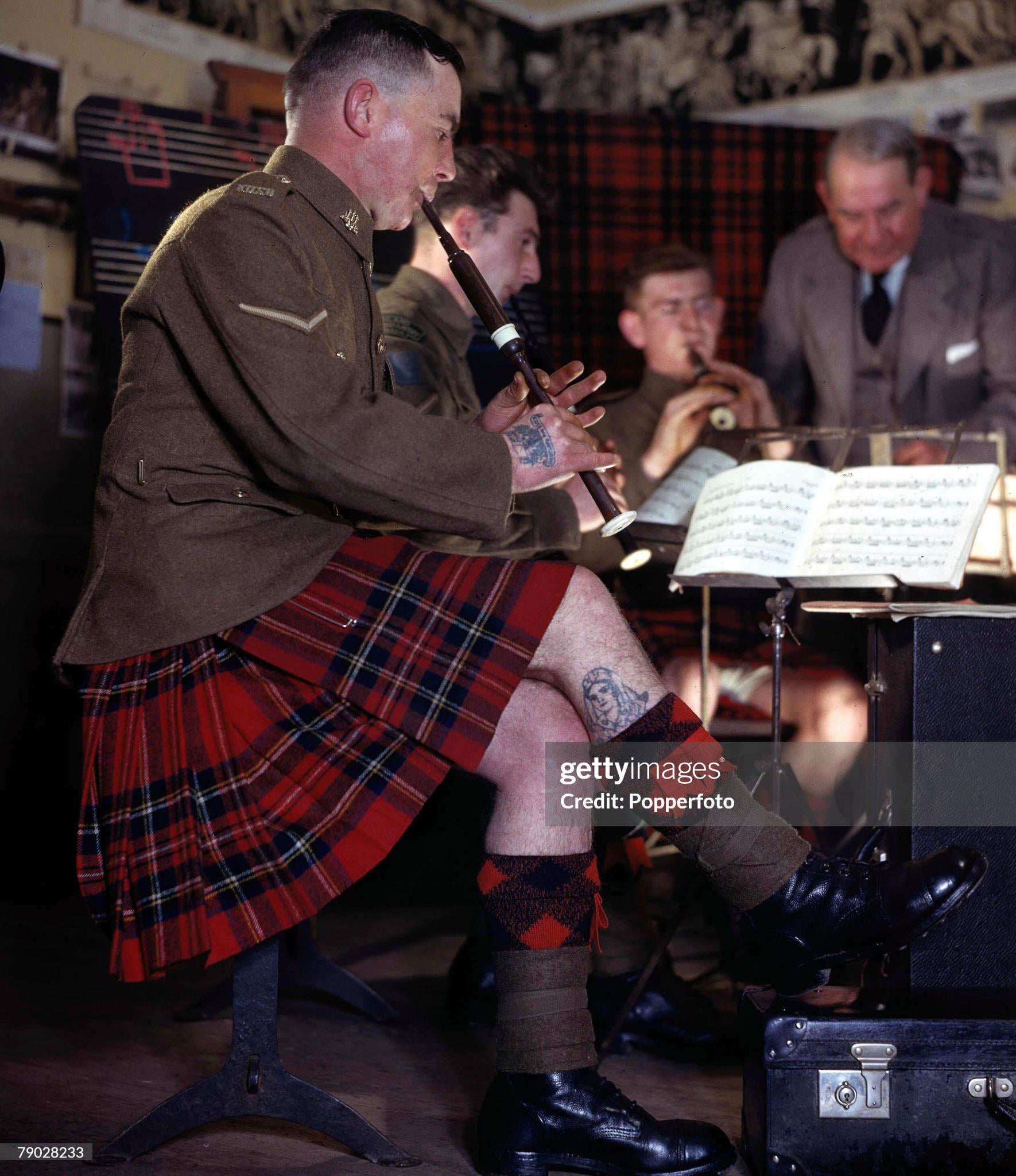 This rare colour photograph, taken in January 1944 at Edinburgh Castle, shows a piping lesson at the Army School of Piping during the Second World War.