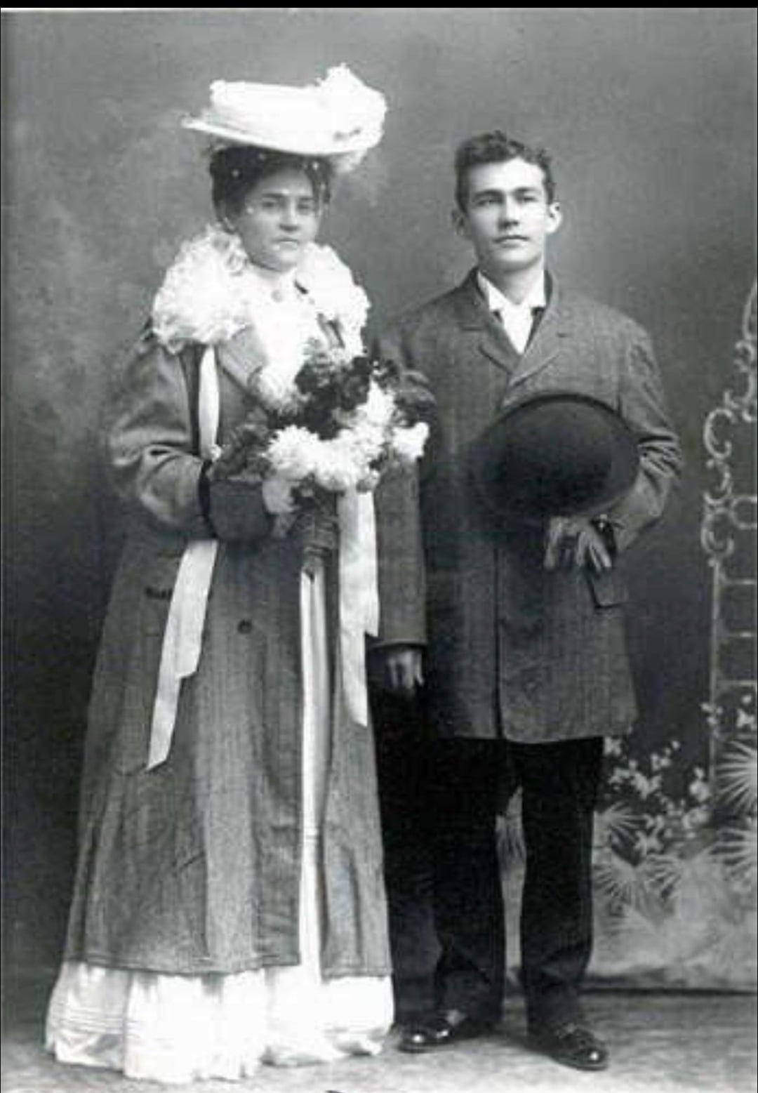 The girl’s hat is different. The dress is slightly different. And of course the guy is different. Are these 2 separate groups of people? Is the guy just different? Is this a wedding photo?