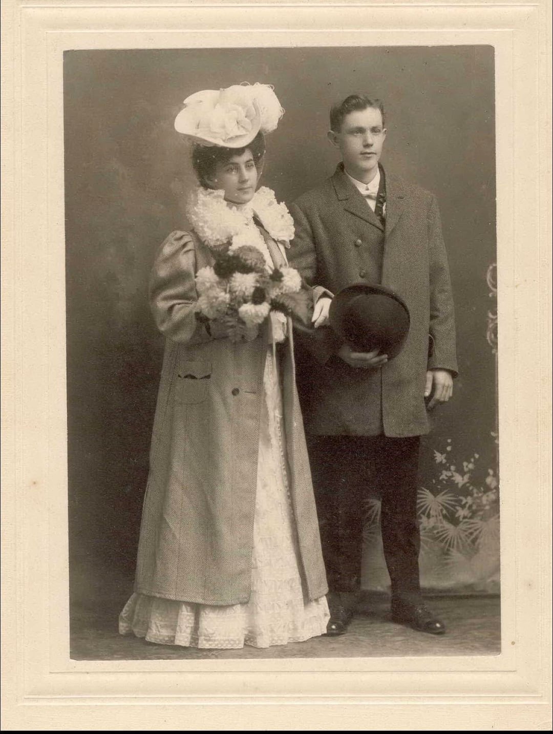 My first thought was it maybe them 5 to 10 years apart. Same couple just grown up and wearing the same or nearly the same outfits to recreate a photo?