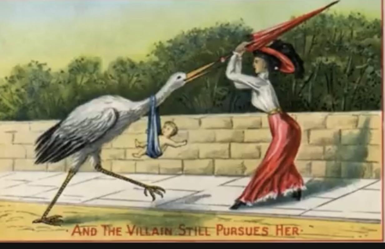 A postcard from the turn of the 20th century; cartoon artwork depicting a woman using a parasol to swat away the stork bringing her a new-born child. The caption reads, “And the villain still pursues her.”[1233×798]