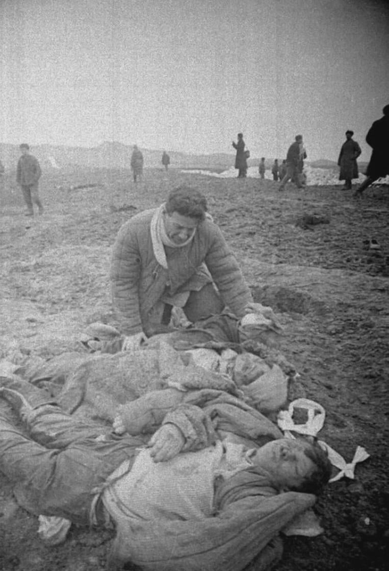 This photo was one of [several taken ](https://imgur.com/a/man-finds-his-wife-children-among-bodies-vLGau4Z)in January 1942, during the brief Soviet liberation of the Kerch Peninsula. Pictured is Grigory Berman, Jewish head of a local middle school. In the background are Red Army soldiers, and local civilians finding the bodies of their families, victims of a Nazi massacre that killed 7,000 Jews.