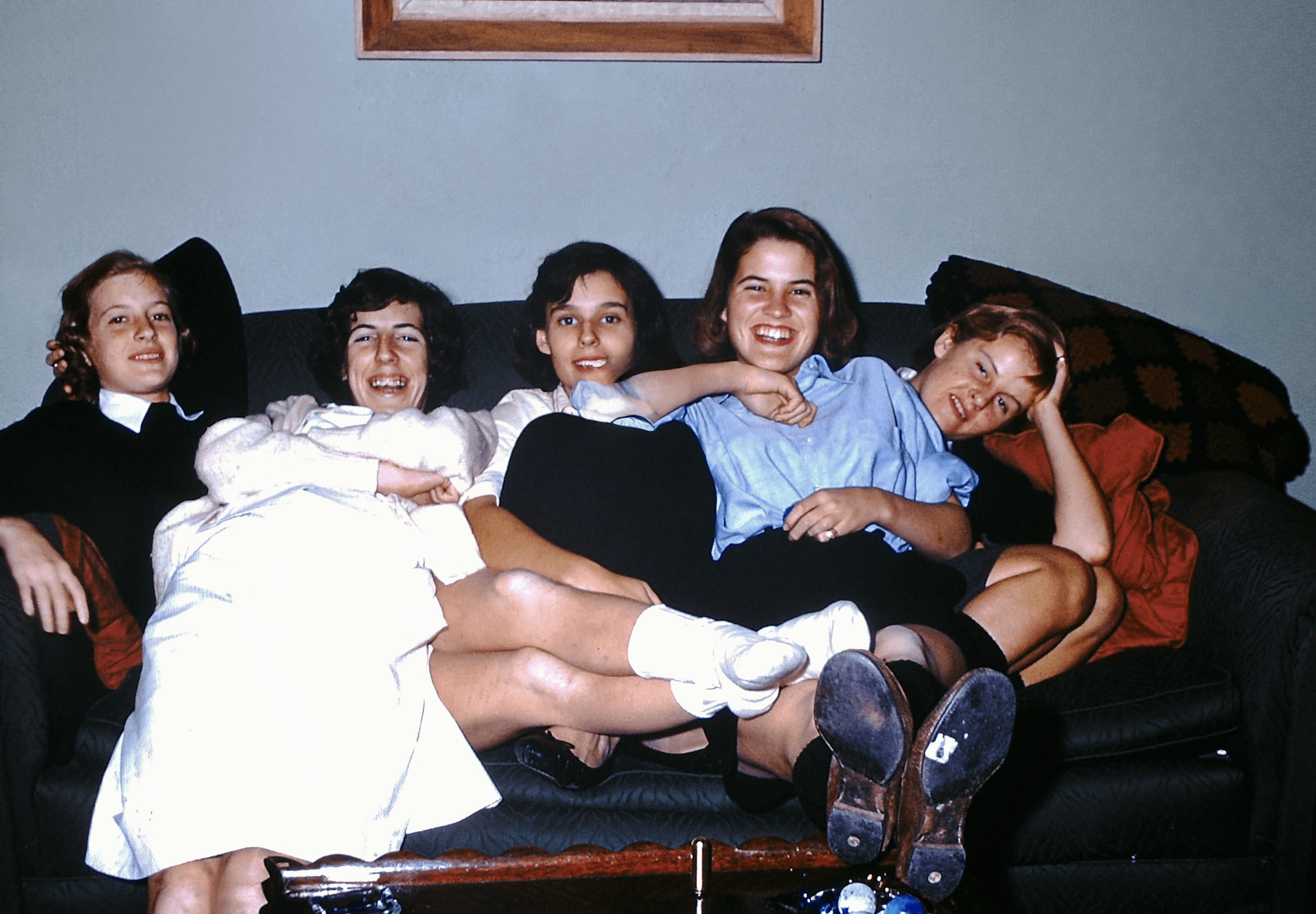 young ladies share a laugh while posing in the sofa. Circa 1950s. You can even see one of the girl has changed her soles of their shoes at least once.