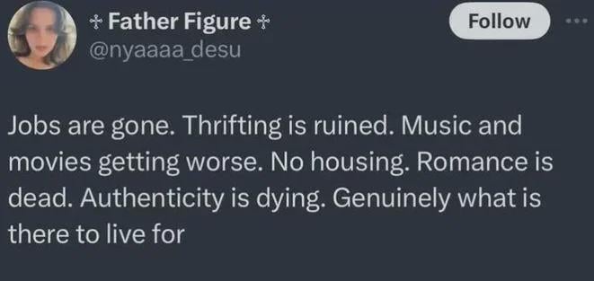This tweet is valid, but I would also counter that we as individuals can make our own authenticity, and we can create things for ourselves and those closest to us. But ALSO, having nothing to live for makes for the perfect fodder for revolution, so viva la.