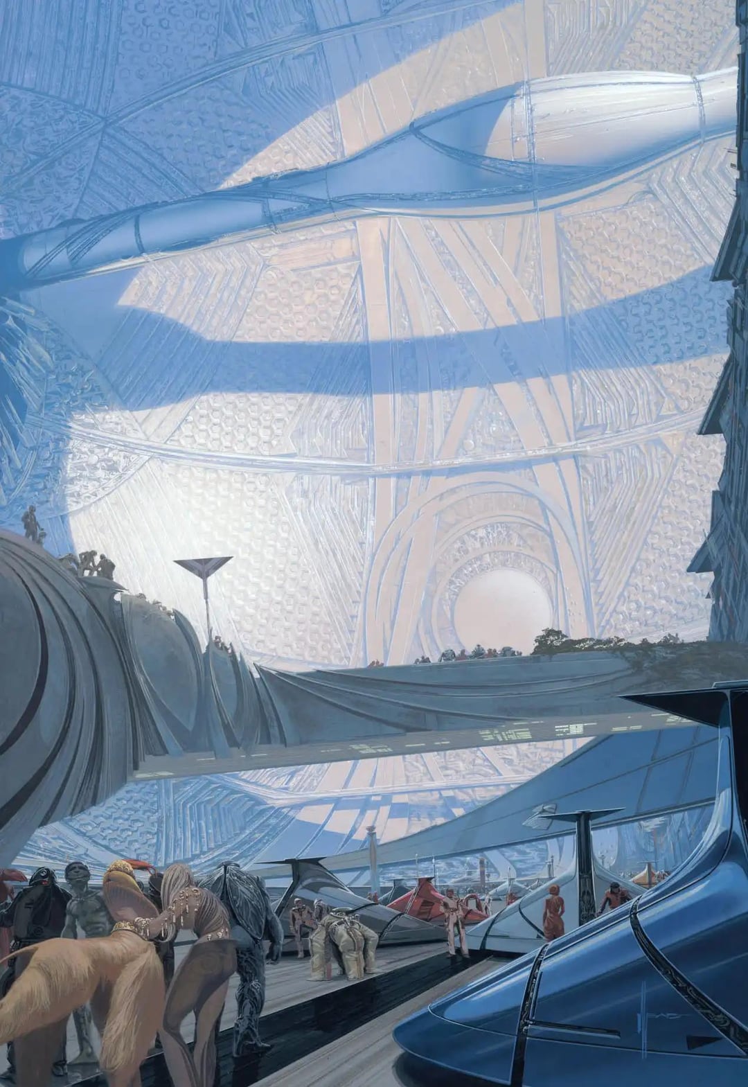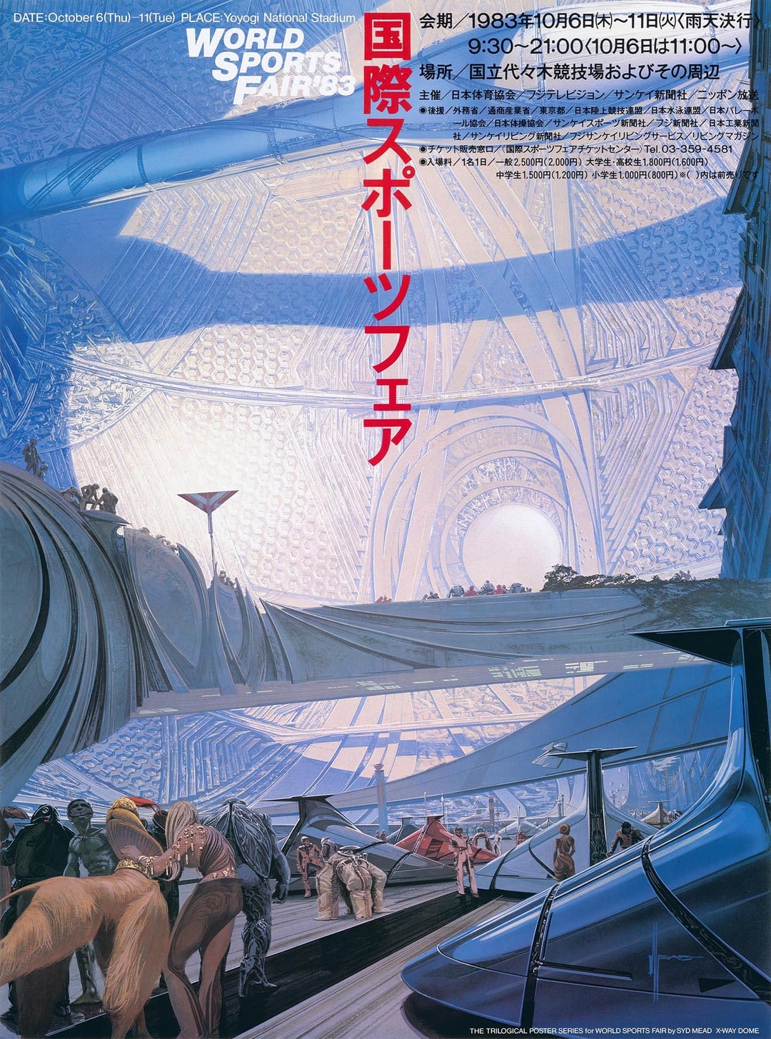 Follow up on my post about work commissioned by the World Sports Fair , Japan , Yoyogi Stadium Oct. 1983 . This is ' silver ' . Multi-wheeled vehicles race around a 10 km diameter sphere at speeds up to 500 km/h . I've included a version without typography .