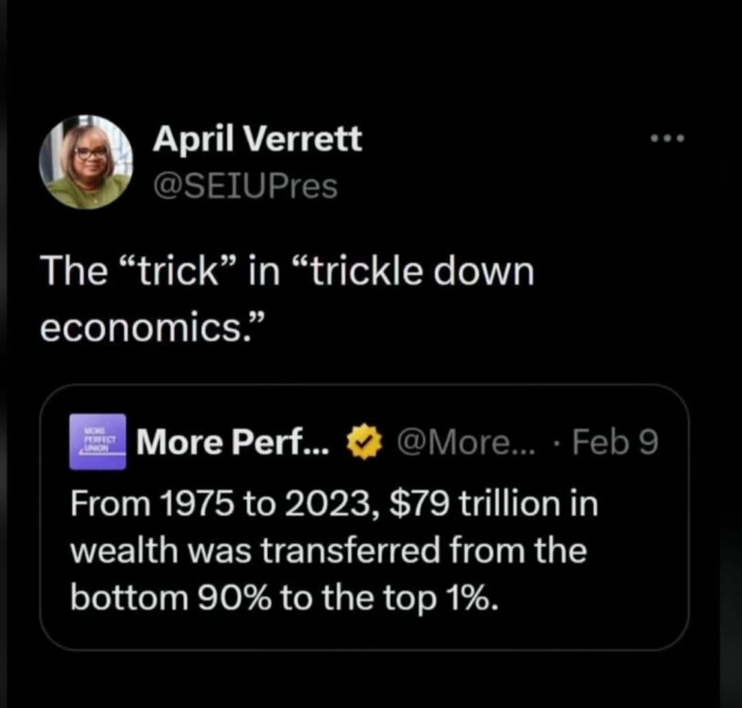Oh it’s working exactly as it was intended too alright. Reagan must’ve been a real charismatic person to convince an entire generation of voters to agree to give out tax breaks to the wealthiest people on earth in hopes of getting the scraps (“trickle”) of their fortune.