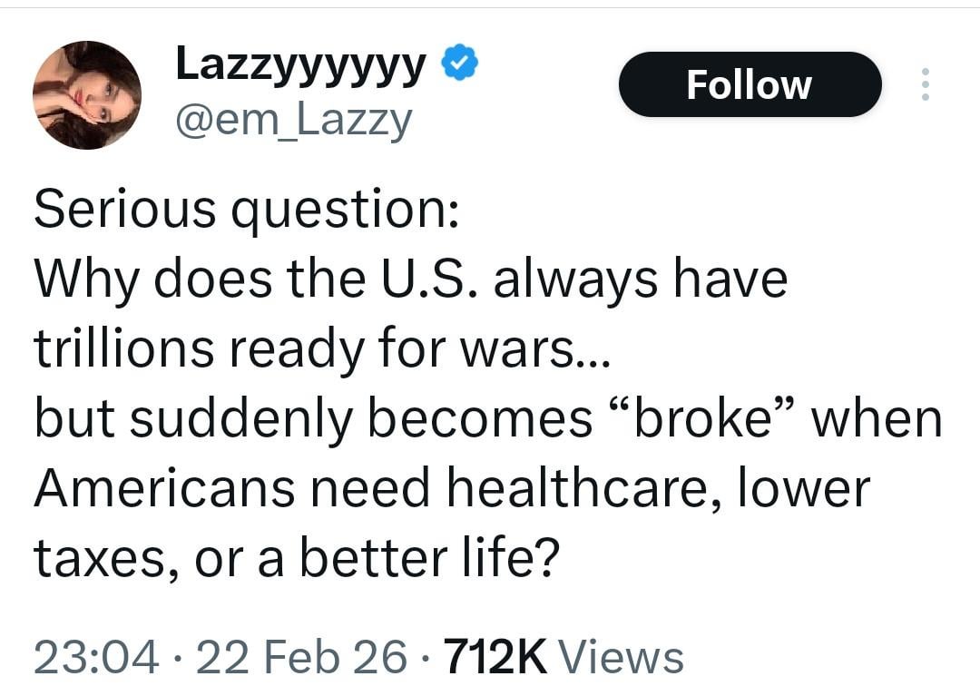 They don’t tax the wealthy. So there isn’t enough money for healthcare and stuff, but for war they are willing to borrow money.