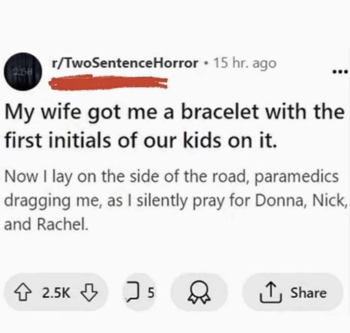This could be a r/twoscentencehorror or r/TwoSentenceSadness post.