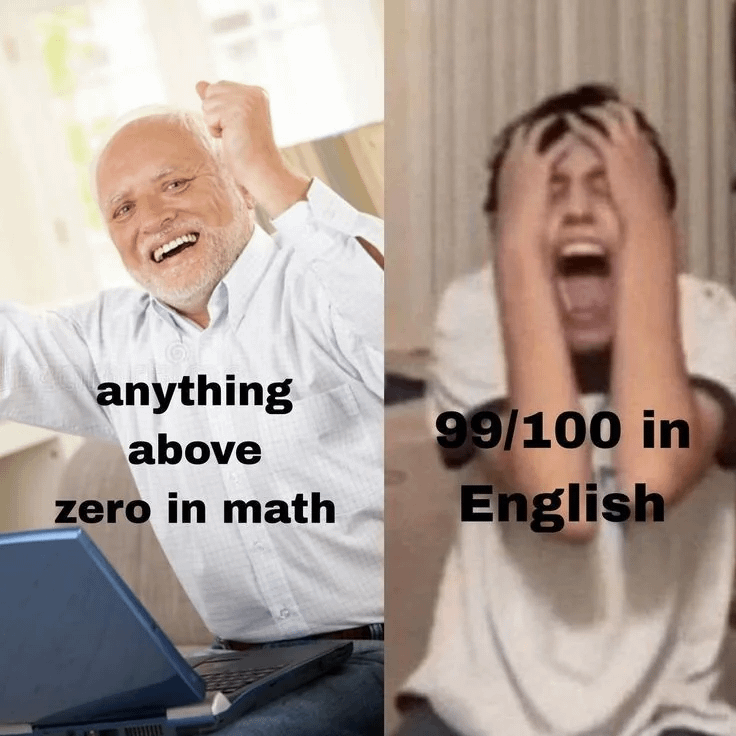 math gave me 2/10 once and i celebrated like i won the lottery, meanwhile english gave me 98/100 and i cried like its funeral