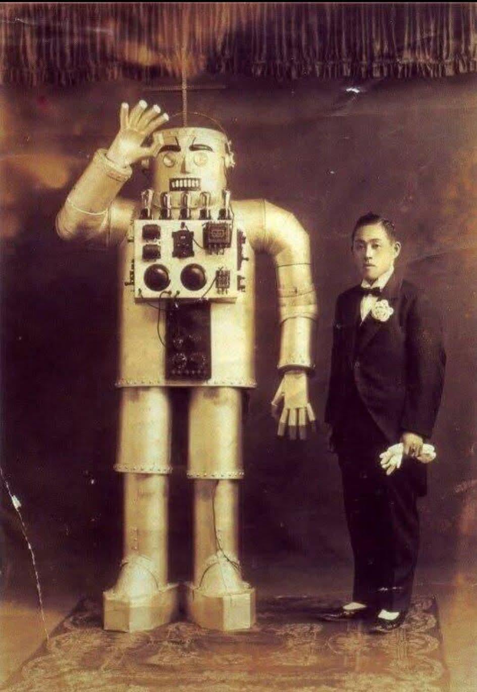 In the bustling streets of Tokyo in 1932, a remarkable figure stood proudly beside his metallic creation: Japanese inventor Yasutaro Mitsui and his imposing steel humanoid robot.This towering automaton—clad in riveted armor, sporting large goggle-like eyes, a stern mechanical face, and exposed wiring that evoked the era’s wildest visions of the future—marked one of the earliest known humanoid robots built in Japan. Captured in stark black-and-white photographs, Mitsui poses confidently in a sharp suit, one hand resting on his invention’s shoulder, as if introducing a mechanical companion to the world.Far from today’s sleek AI-driven machines, this robot was more sculpture than servant: rigid fingers, fixed neck, legs suggesting no true walking ability, and arms capable only of basic shoulder and elbow motions—perhaps a polite bow or wave, fitting for its Japanese origins. Powered likely by electricity (a cord trails up one leg), its glowing valves and dials were probably as much for dramatic show as function, echoing the theatrical robots of the West like Televox.Yet in an age when science fiction was bleeding into reality—think Metropolis (1927) or the rise of automation—Mitsui’s creation captured Japan’s budding fascination with mechanized life. Documented in later works like Haruki Inoue’s 1993 book on early Japanese robots (1920–1938), it stands as a pioneering milestone in robotics history, a bold leap from imagination to riveted steel.Nearly a century later, gazing at these vintage images feels like peering through a time portal: proof that the dream of humanoid companions was alive and clanking in Tokyo long before Asimov’s laws or modern androids.