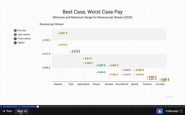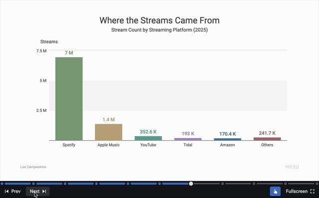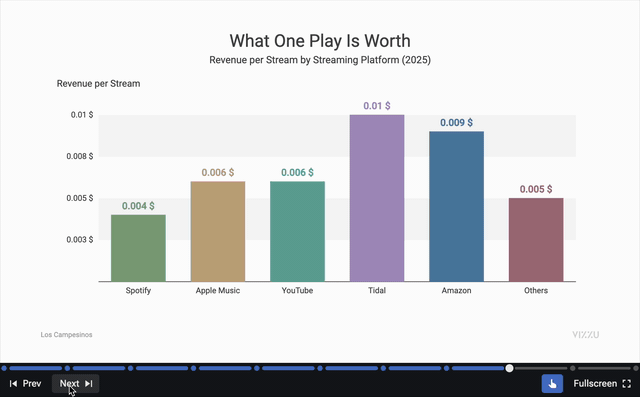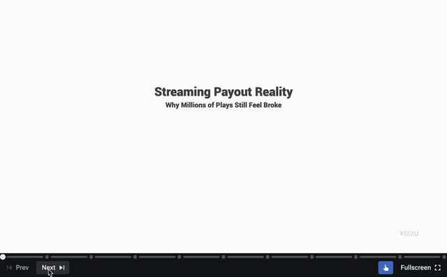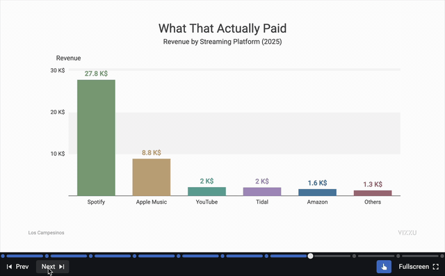 Streaming payouts are still pretty non-transparent, so I put together a small data viz on what it actually takes to earn money on Spotify. Roughly 300 streams = $1, and I also visualized real payout numbers using the band Los Campesinos as an example.