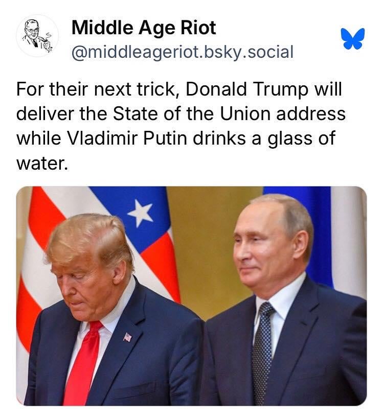 thissomeotherplace on February 24, 2026 7:25 pm I wonder if you’ll be able to see Putin’s hand up his ass