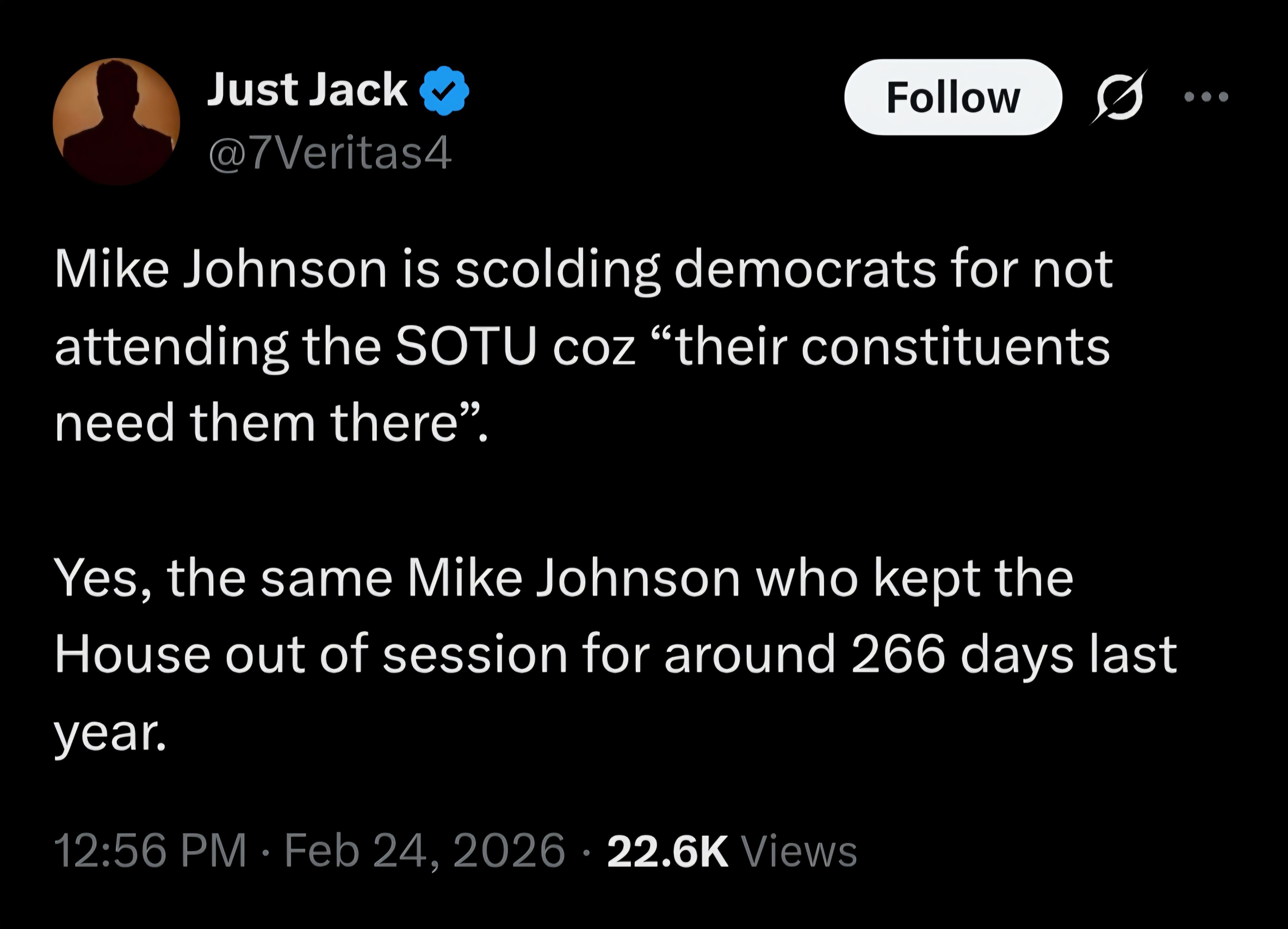 Umm, why do the constituents need for their representative to be at a speech? It is printed, and televised. They can watch if they want, or not….being in the room does fuck all for their constituents. As for the post OP made…..that is a bigger issue, when MJ doesn’t get his way, or is trying to appease big orange, he just keeps the house out of session.