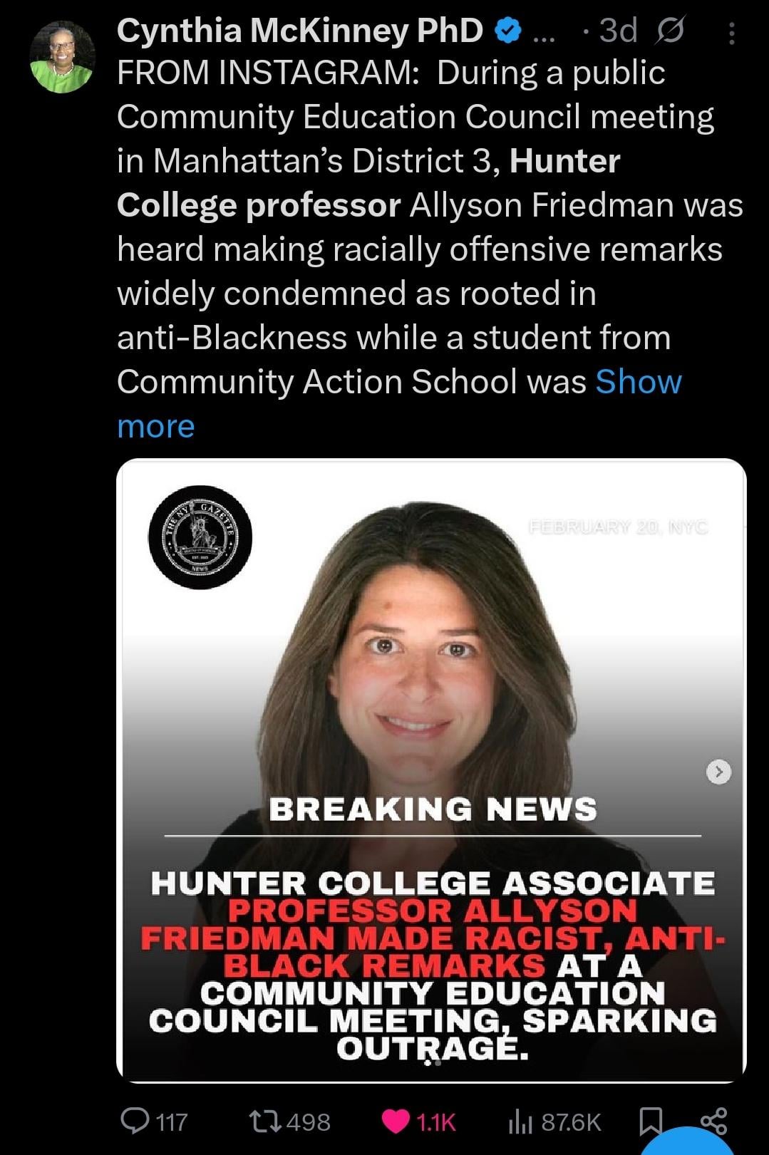 6. Surprised but not surprised. I went to Hunter. For a CUNY school, there weren’t many black students and many times I was the only black person in a class. Not surprised to hear a professor who probably don’t have a lot of black students, talk shit about them. You think with her expertise she would know better. She should be fired, but you know conservatives are keeping an eye on this and will have something cushy lined up for her to continue spreading hate.