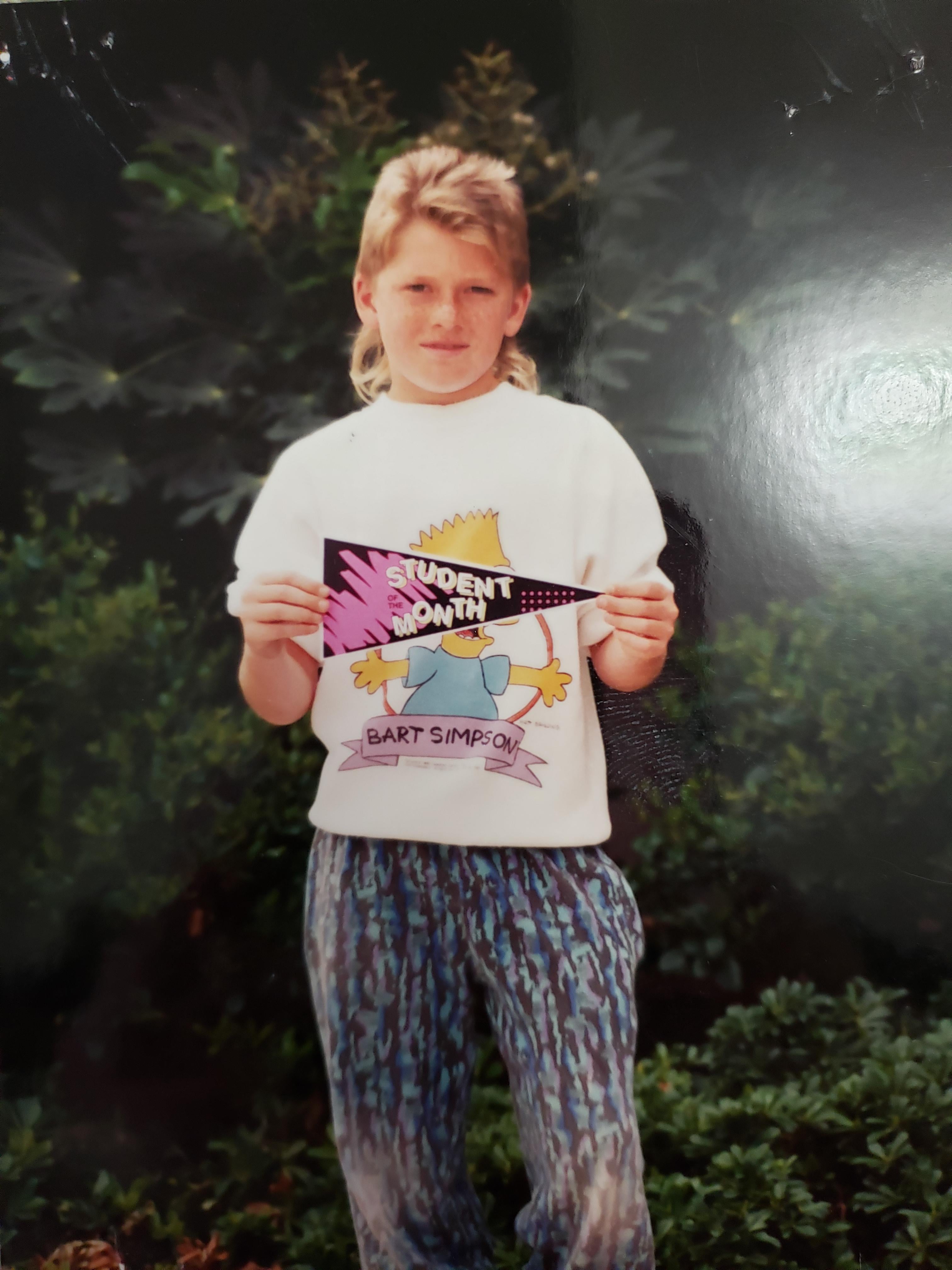 that bart simpson shirt is peak early 90s energy 😭 the patterned pants and the mullet just complete the whole time capsule vibe, honestly iconic