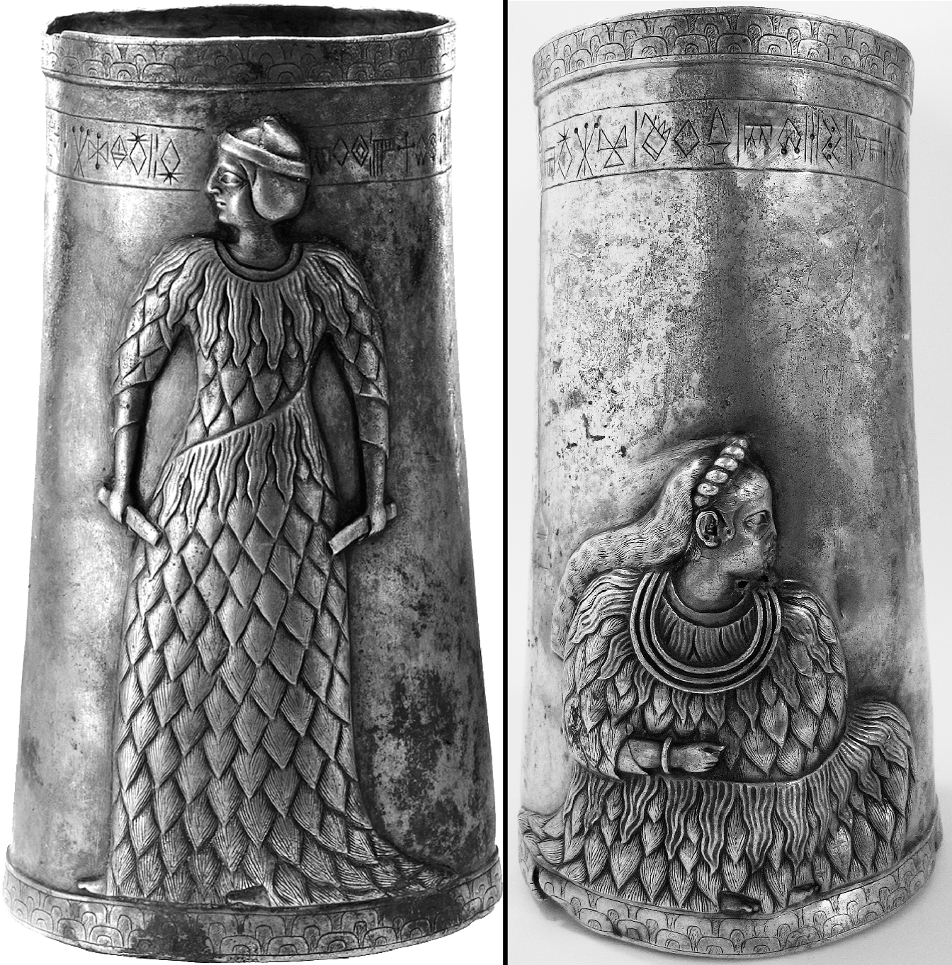 An Elamite silver cup found in Marvdasht, Iran, depicting on one side, a standing woman wearing a kaunakes and a tiara or headband, and on the other side, a seated woman with long flowing hair, also wearing a kaunakes, 3 necklaces and a braid or hairband. 2000 BCE, Museum of Ancient Iran [1344×1362]