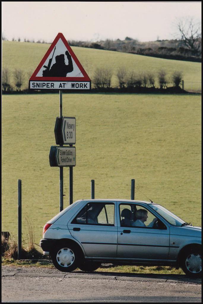 A road sign warning the British Army of active IRA snipers in County Armagh. (1994) [684×1023] by StephenMcGannon