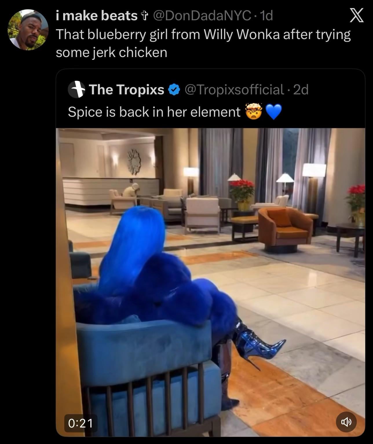 pure blueberry energy shes owning that wonka glow up
