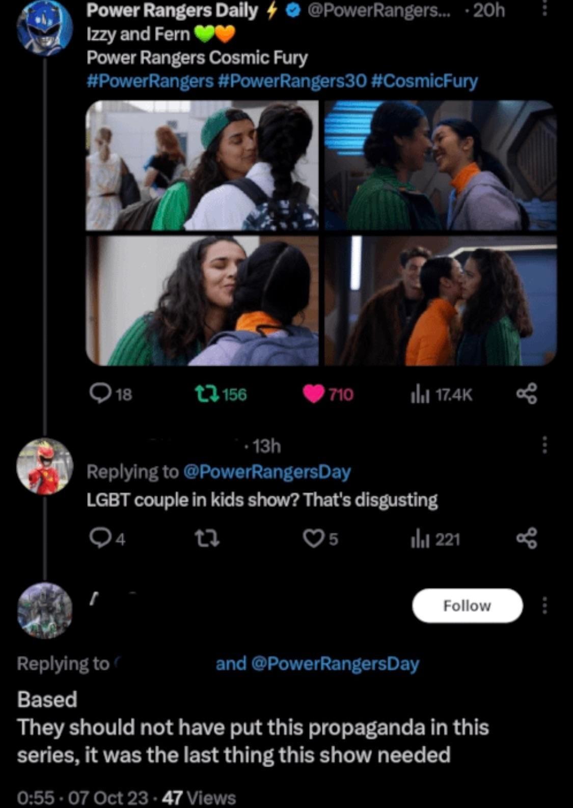 I believe there have been interviews with David Yost, the original blue power ranger actor, talked about how after having the longest stay on the show, longer than any of his co-actors, he eventually left the show because members of the cast and crew harassed him for being gay. The fact that we’ve come far enough for power rangers to have a canon lesbian couple is amazing, and the fact people like this see this as a bad thing is horrible