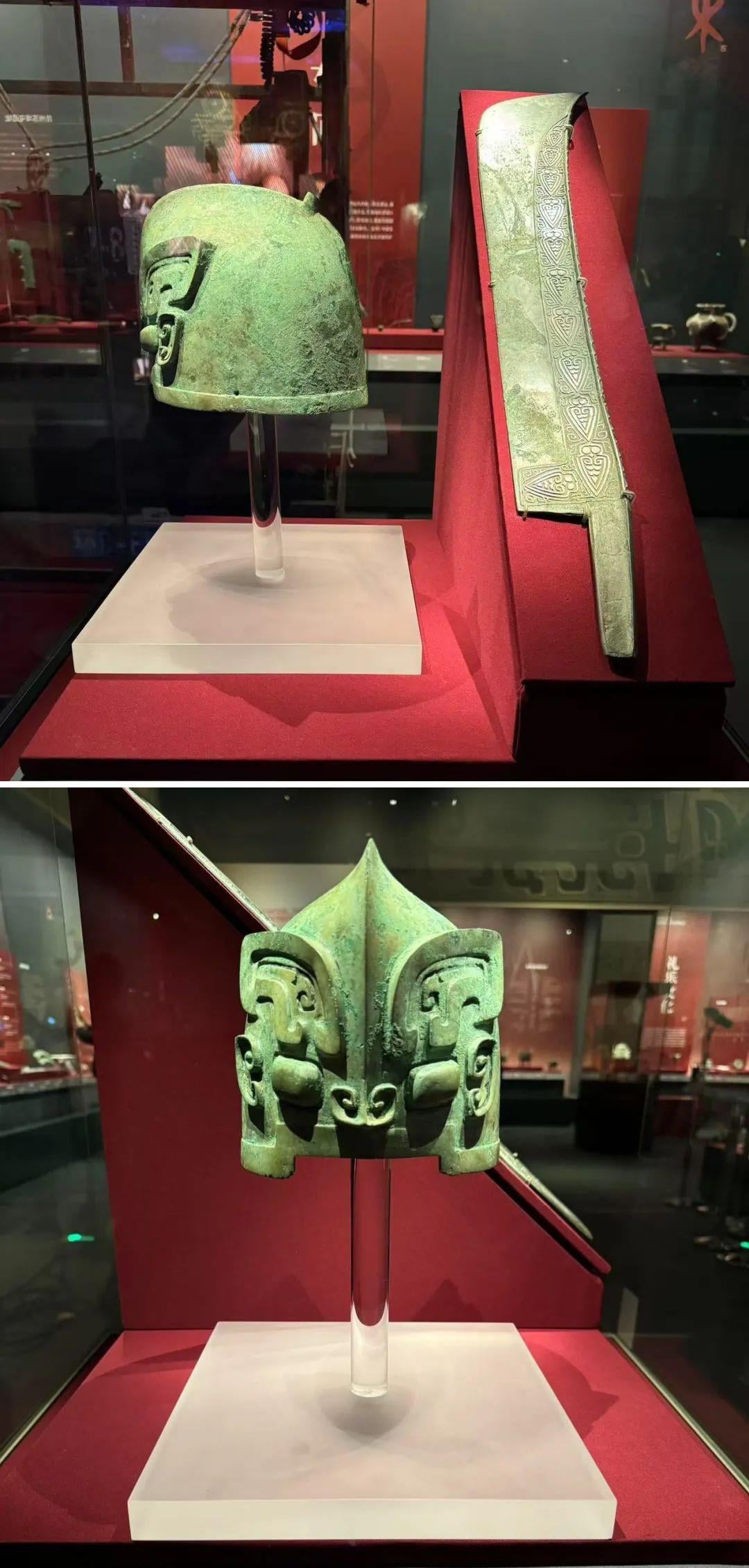 A bronze helmet with animal mask pattern, and a bronze broadsword with cicada pattern, both unearthed in 1989 from the Dayangzhou Chengjia site. 1200 BCE, Wucheng culture, now housed at the Jiangxi Provincial Museum in China [1080×2260]