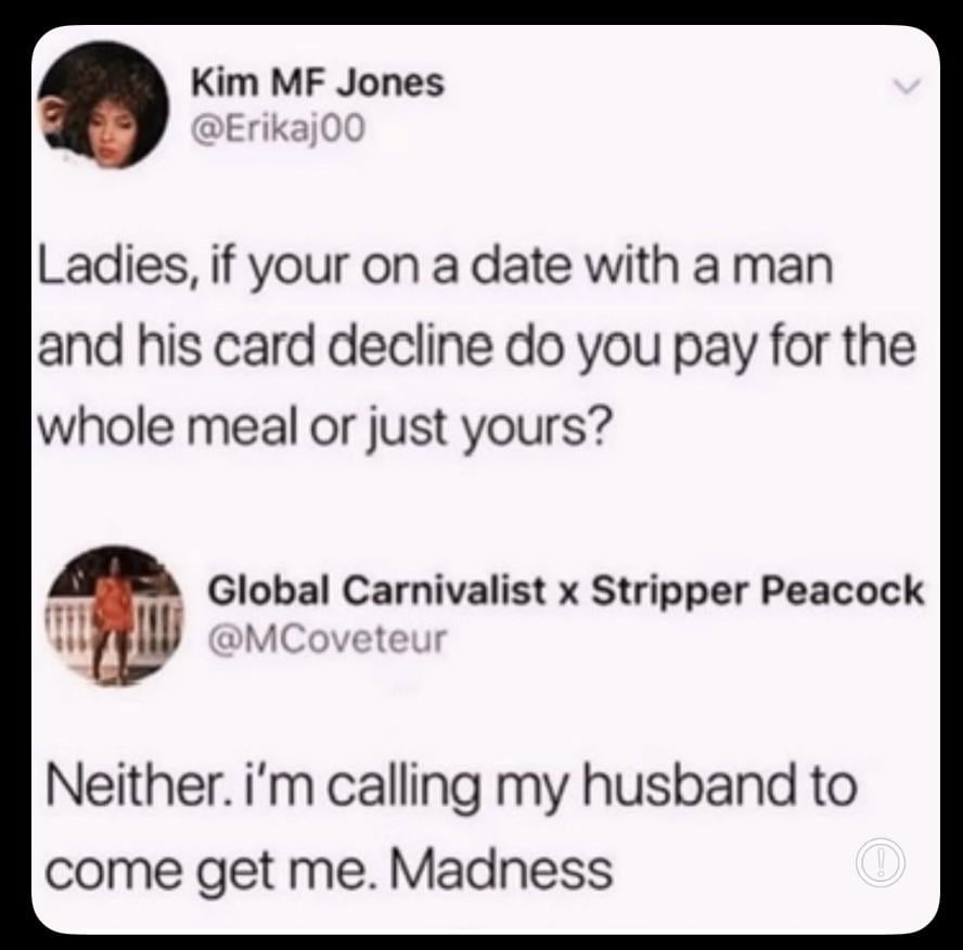 Danimus-Prime on February 26, 2026 3:14 am I don’t think he’s gonna pick you up when he finds out why you’re at a fancy restaurant with another guy