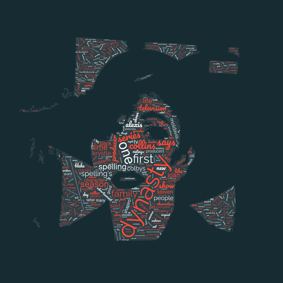 Second image uses the articles for a wordcloud representing Alexis Colby (Joan Collins) from Dynasty.