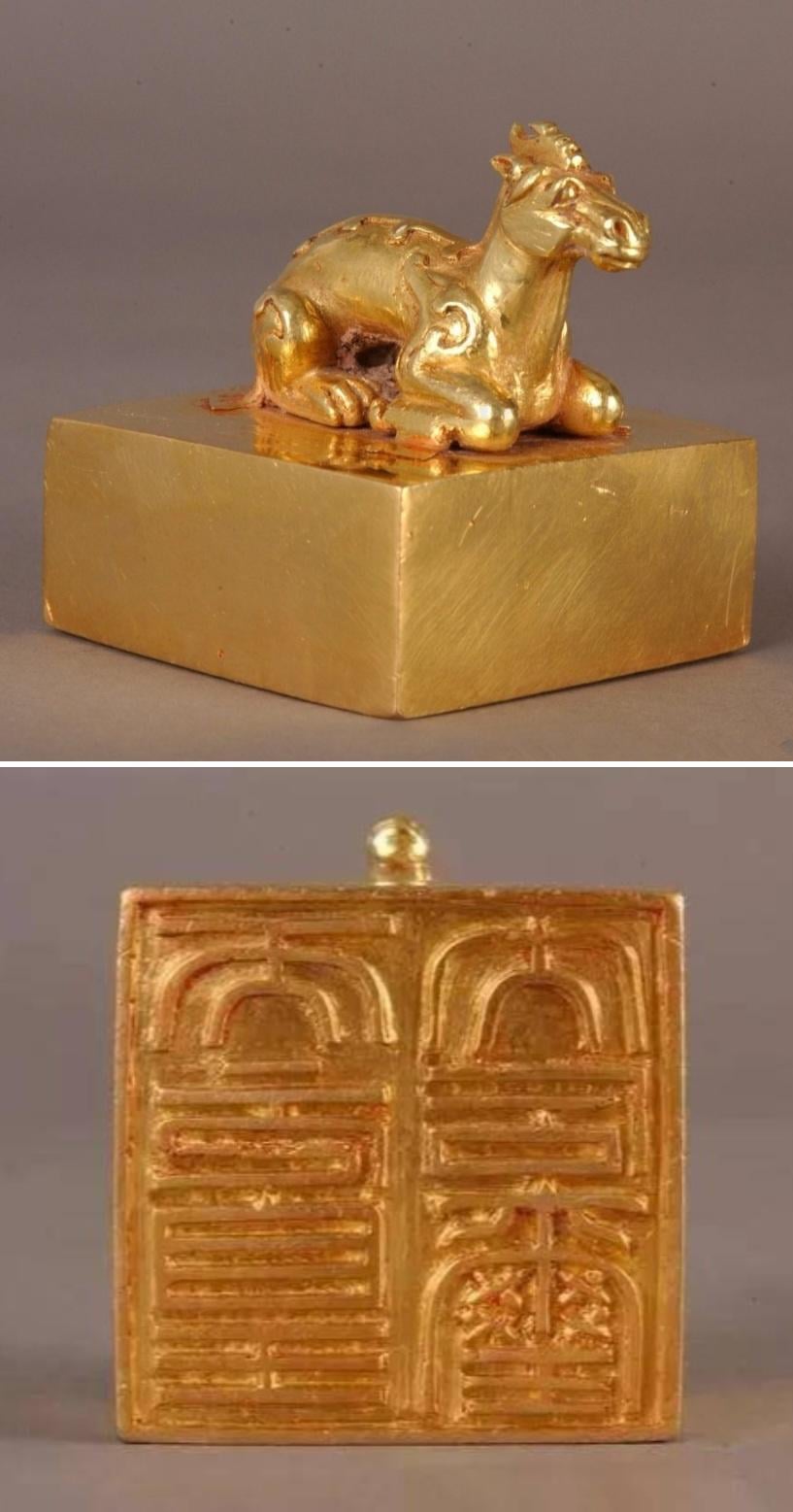 The golden seal of the Empress Ashina, made in 579–580 CE with inscription “Empress Dowager Tianyuan” in large seal script. Ashina was a Göktürk princess who became an empress of the Northern Zhou dynasty by marrying the Emperor Wu. Now housed in the Xianyang Museum, China [817×1557]