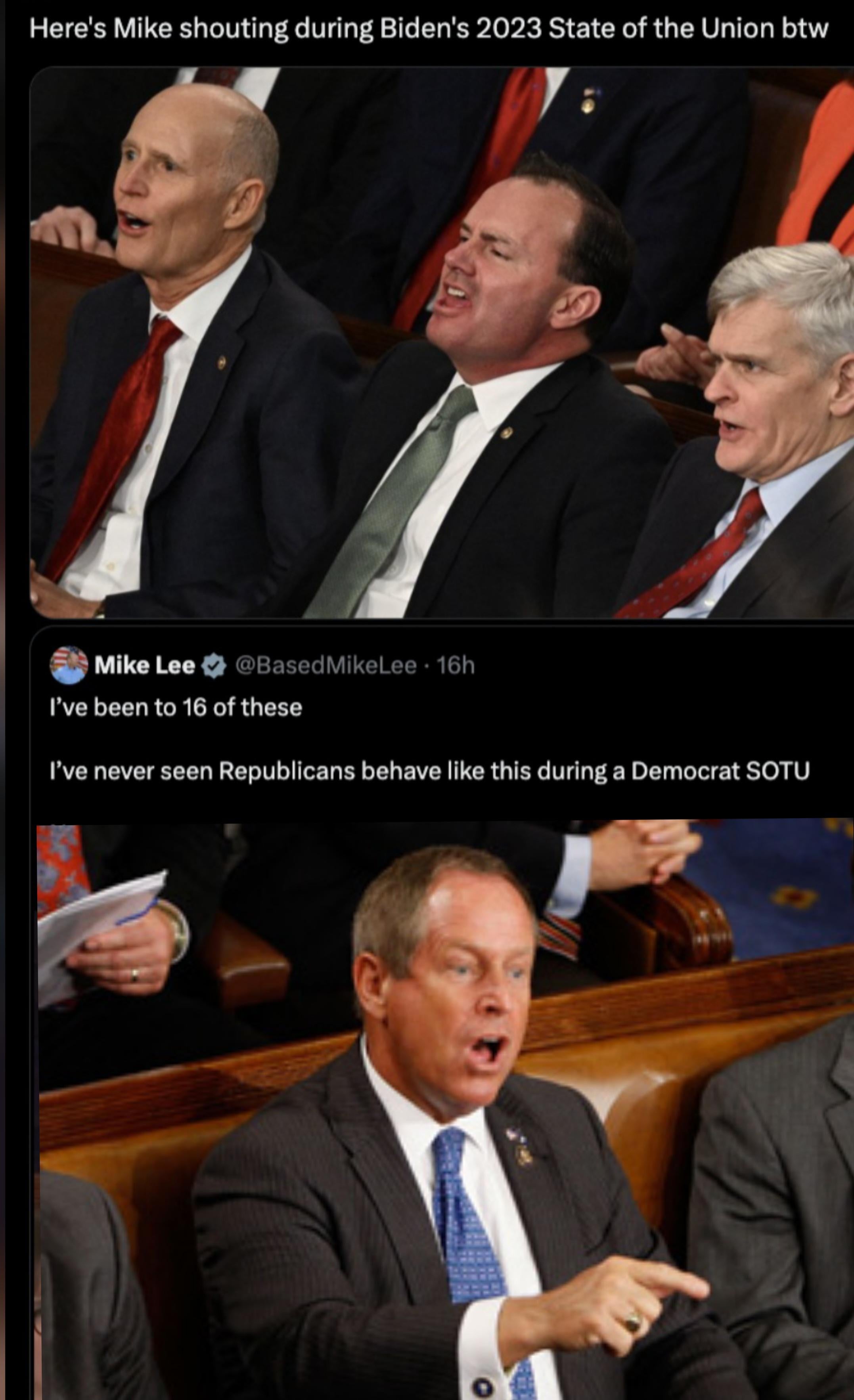 He must’ve missed Boebert and Greene acting like howler monkeys and flinging feces at a Biden SOTU.