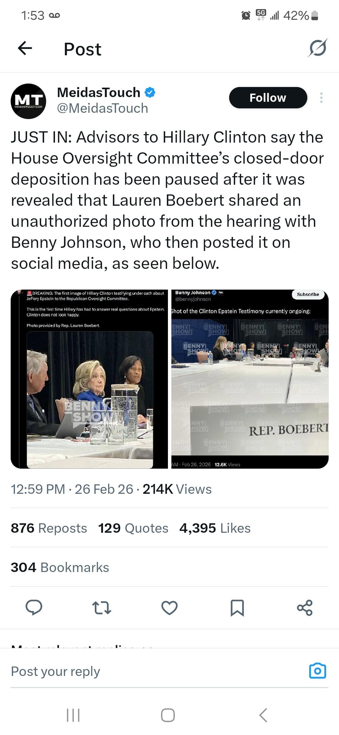 This seems 100% calculated to start rumors and theories about this deposition. I’ve already seen some online news outlets frame this as just Hillary stopping the deposition, without further context or mentioning that Boebert disrupted the hearing by sending a photo.