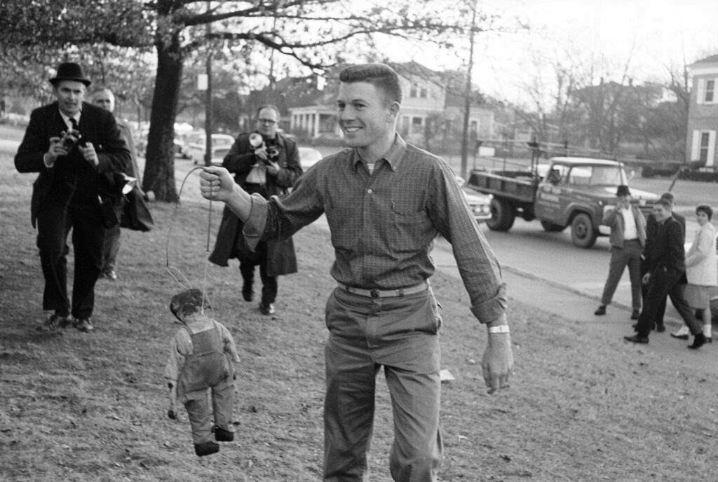 Pro-segregation protester at the University with a prop, the same day the first 2 African american students were admited, 20 of January 1961 [688×1024]