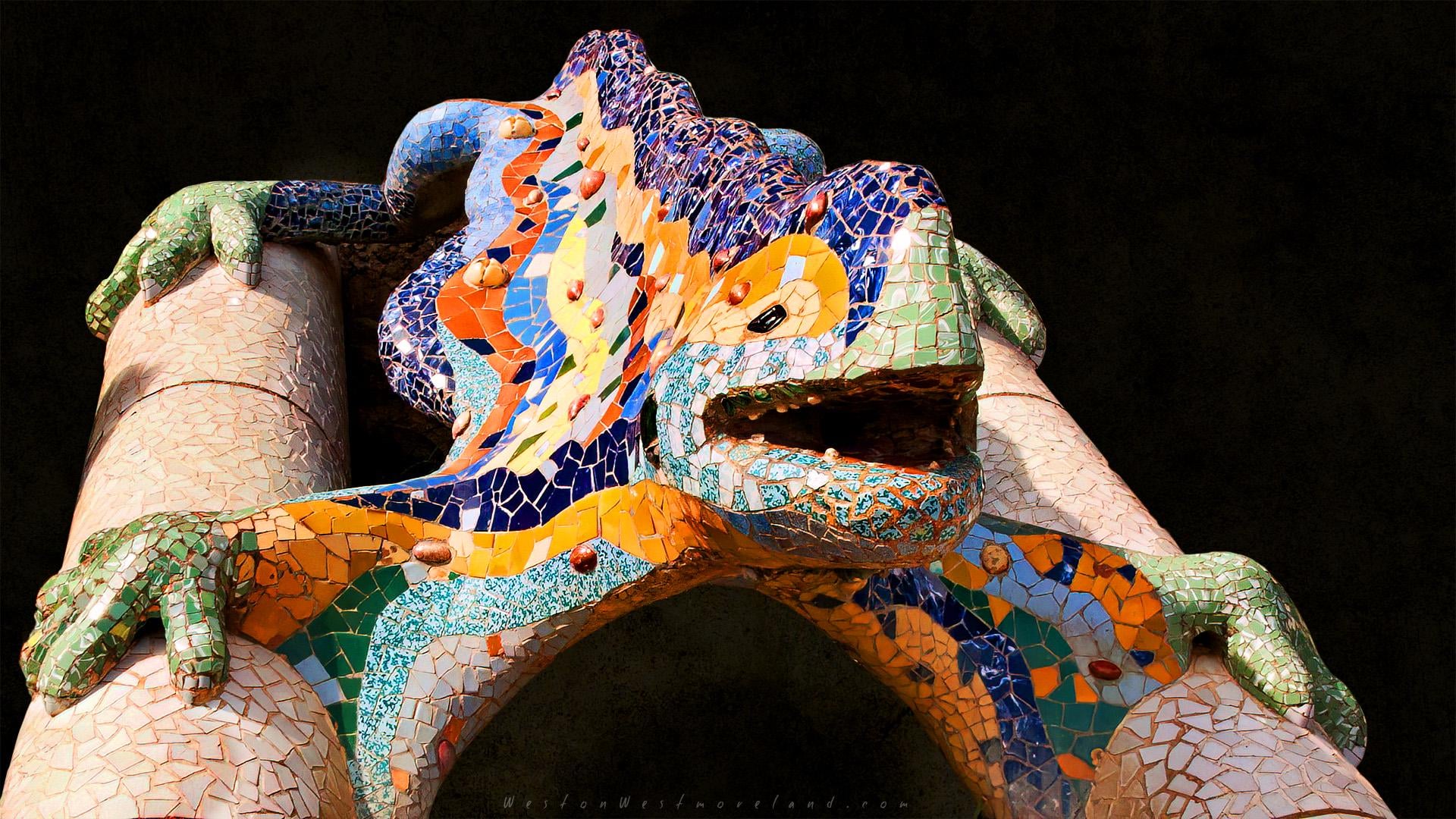 Gaudí’s salamander, Park Güell, Barcelona. An iconic trencadís mosaic sculpture on the entrance staircase. The salamander symbolizes nature and Catalan mythology in Gaudí’s modernist work and greets the visitors to the park. Gaudí designed this piece around 1900-1914. [1920×1080] [OC]