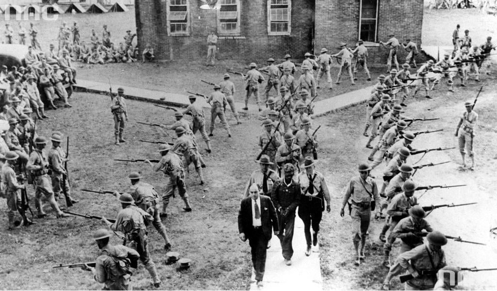 Guarded by 400 troops of the Missouri National Guard, John Henry Riney, a young black man charged with raping a white woman, is escorted to his trial (Arkansas, 1941) [1024 x 600].