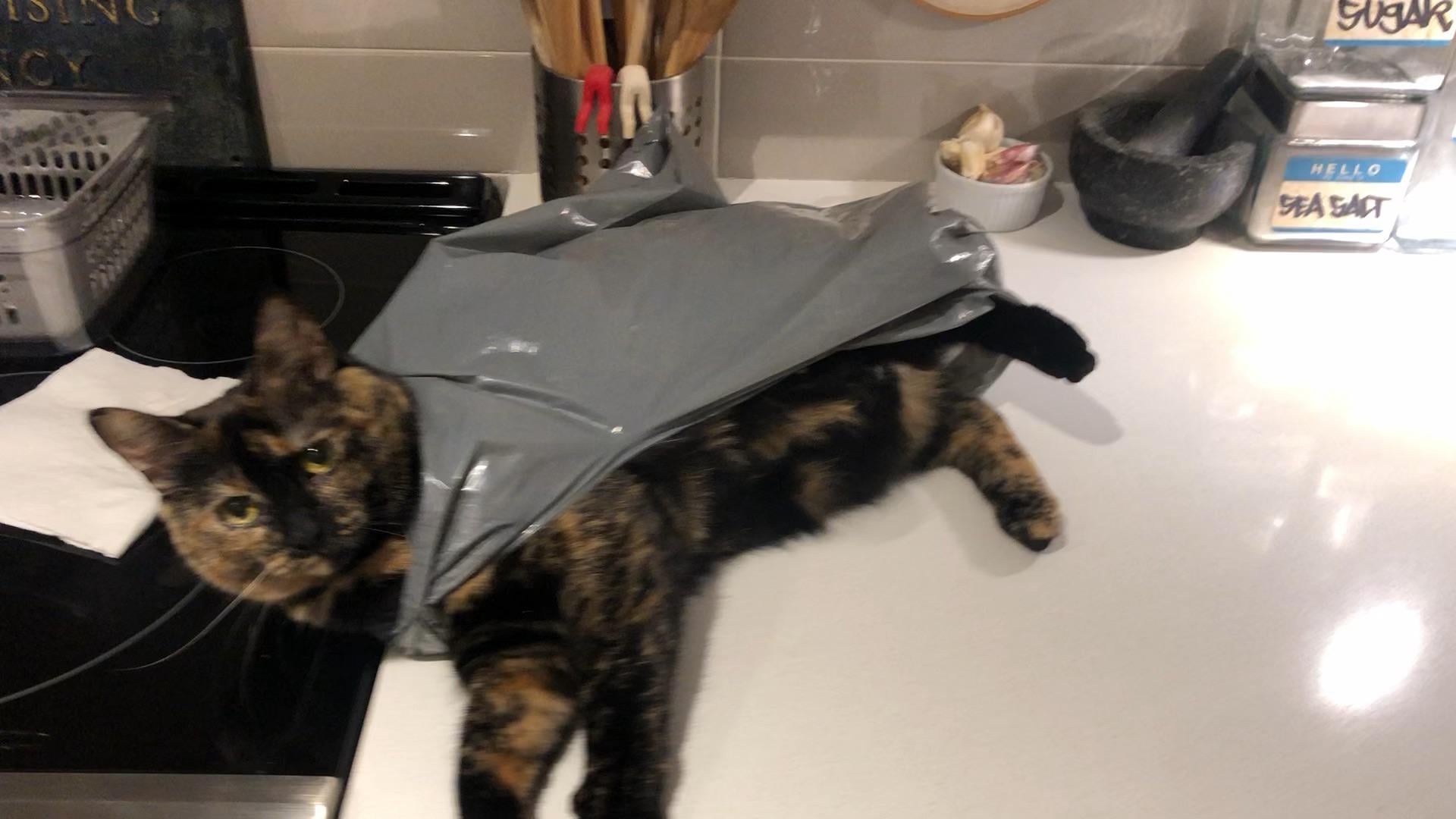 My tortie does the exact same thing! We call them her plastic capes 😂