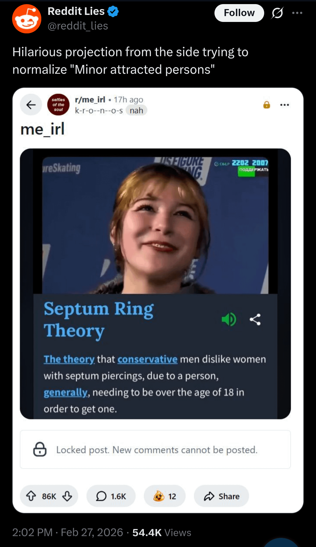 Hilarious projection from the side that elected and still actively defends a minor attracted person, better known as a pedophile